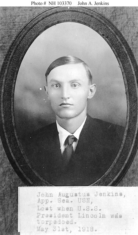 Soon after the end of the First World War, the surviving crew members of USS President Lincoln formed an association that, among other things, tried to perpetuate the ship's memory by erecting memorial plaques listing the men killed when she was sunk. Photographs of these plaques are presented on another page in this series. The President Lincoln Club also collected pictures related to the ship, her men, and her loss. These, subsequently donated to the Naval Historical Foundation, constitute the bulk of the images contained in the several pages of this presentation. Among them are photographs of all three officers, and seven of the twenty-three enlisted men, who were lost with the ship. Most of these photos were presented to the Club by President Lincoln's former Commanding Officer, Rear Admiral Percy W. Foote.