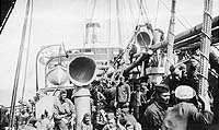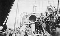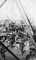 Troops on the ship's starboard fore deck, during their homeward