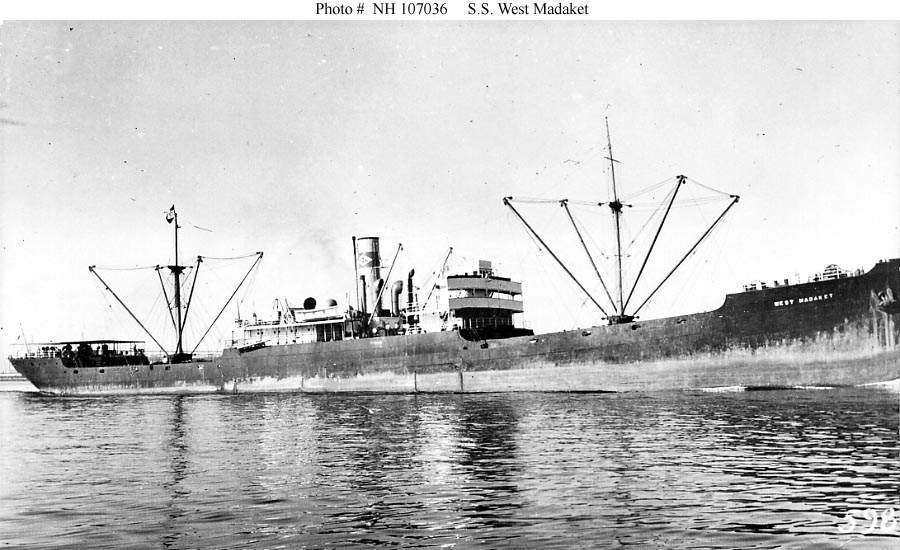 West Madaket, a 5808 gross ton (12,225-tons displacement) freighter, was built in 1918 at Seattle, Washington, as part of the First World War ship construction program. Transferred to the Navy when completed, she was placed in commission as USS West Madaket (ID # 3636) at the end of October 1918. The ship carried a cargo of flour from the West Coast to Rotterdam, Holland, between mid-November 1918 and January 1919, passing through the Panama Canal and stopping at New York and Falmouth, England, while en route. During February-April 1919 the ship made a second round-trip voyage to Europe, taking general cargo to France. USS West Madaket was decommissioned in May 1919 and returned to the U.S. Shipping Board.