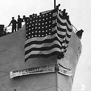Photo #: NH 65081 (cropped) Fourth Liberty Loan, 1918 Banner reading "Buy a 4th Liberty Loan Bond -- that the Government may build more ships", hung from the bow of S.S. Westpool during her launching at the J.F. Duthie and Company shipyard, Seattle, Washington. This image is cropped from Photo # NH 65081. U.S. Naval Historical Center Photograph. Online Image: 62KB; 650 x 675 pixels |