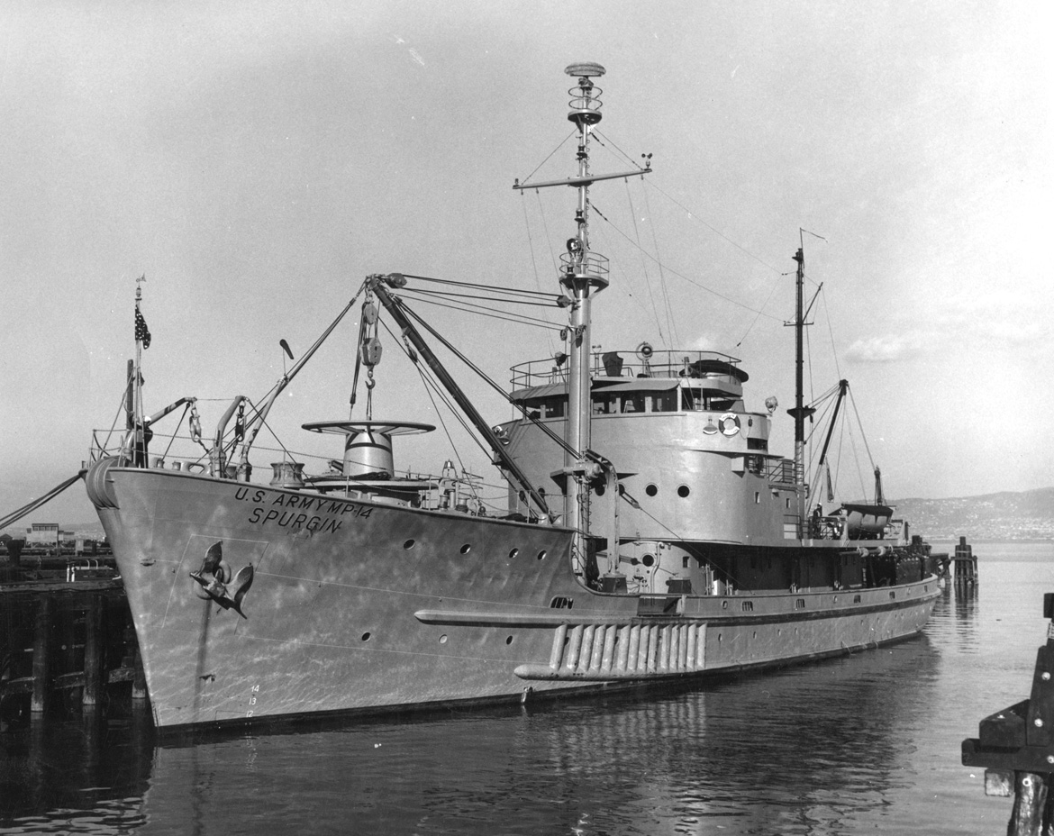 At the U.S. Naval Station, Treasure Island, Cal, on 25 January 1950, the date of her commissioning in the Navy. She is still wearing her Army name, rendered as Spurgin with number MP 14. Effective 1 May 1955, USS ACM 13 received the name Miantonomah.