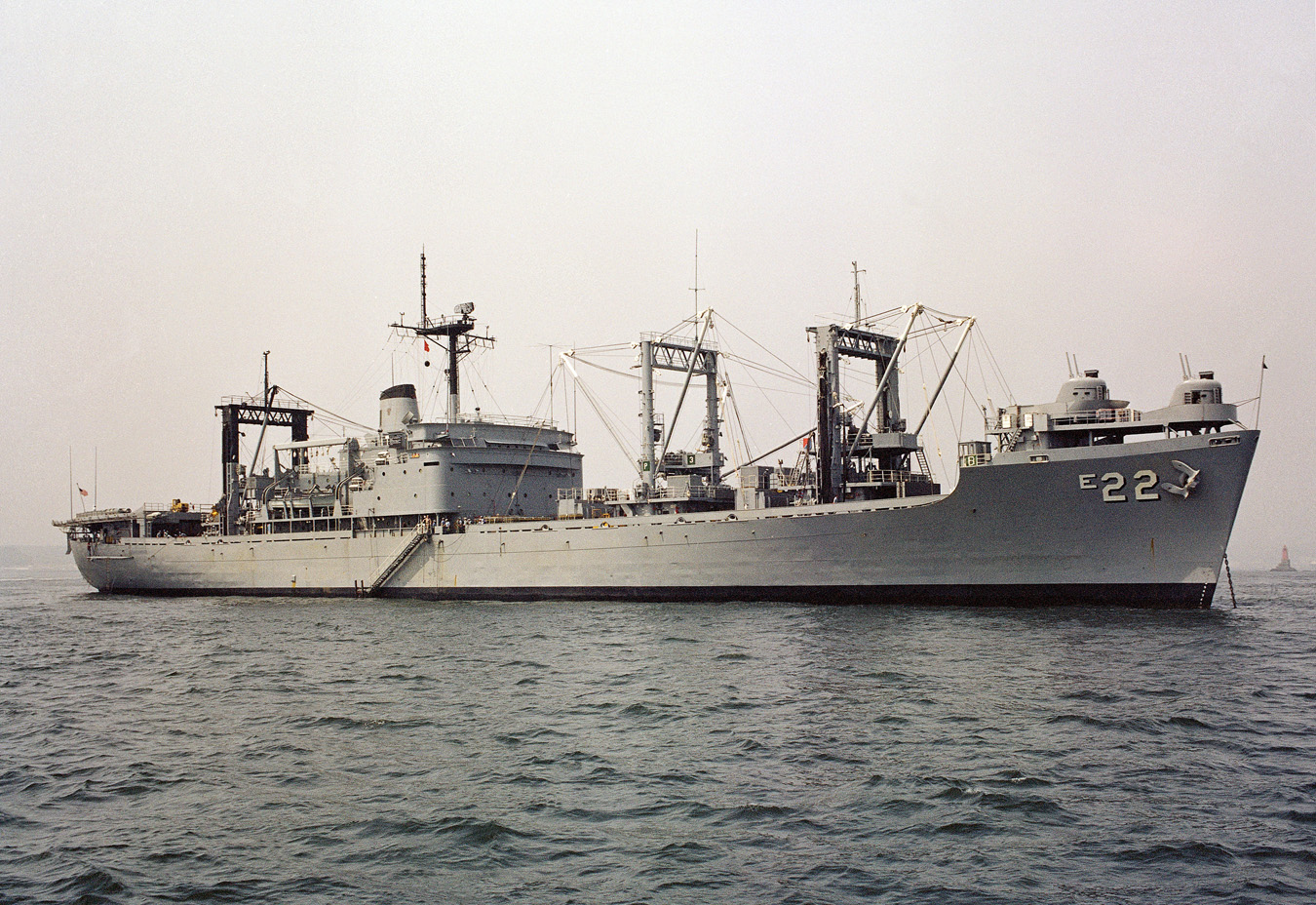 An undated photo of the ship after her FAST conversion with sliding block replenishment rigs forward and aft. The shorter middle kingpost pair, which still has its curved hoods, was retained from the original rig.