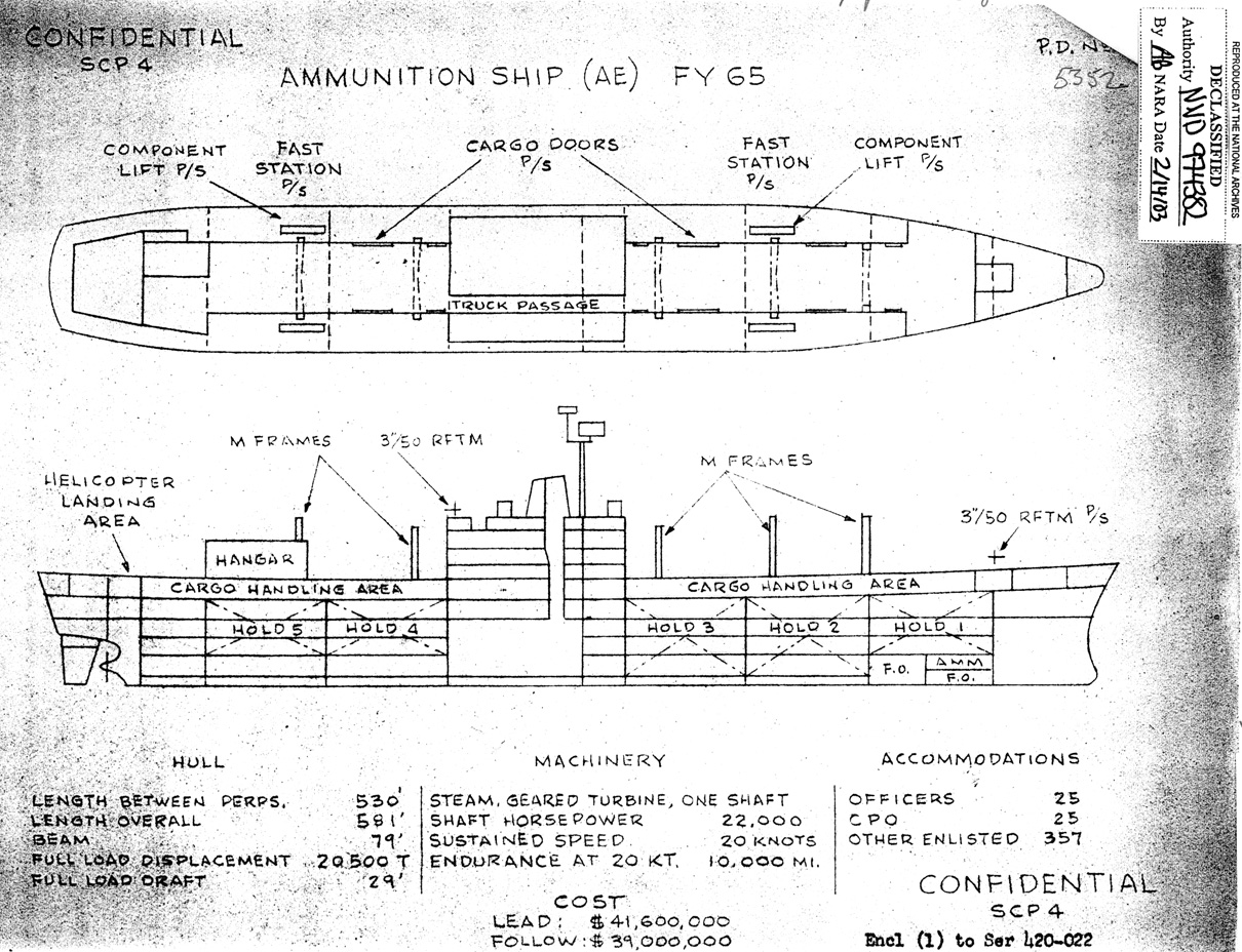 This, the first preliminary design for an AE in the Fiscal Year 1965 building program, was based on the Maritime Administration's Mariner C4 cargo ship and generally resembled the FY 1961 Mars (AFS 1) class. Between the production of this design in April 1963 and the approval of the final characteristics for the AE 26 class in March 1964 the layout of the design was radically altered.