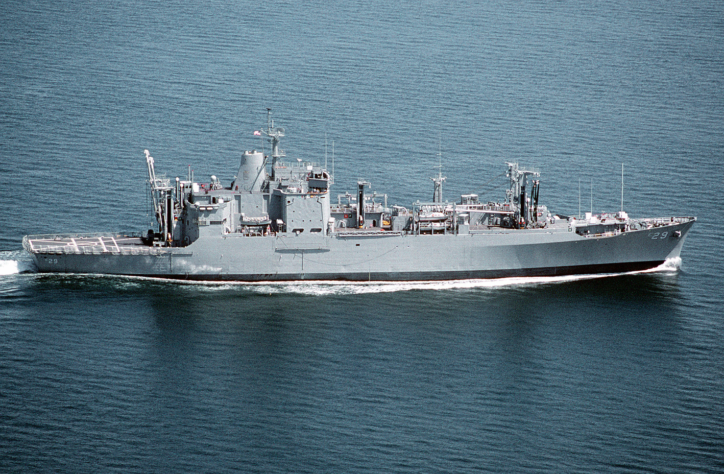 In the Mediterranean on 12 March 1988 as just modified with close-in weapons systems (CIWS) mounts replacing the twin 3"/50 gun mounts in the forward port and after starboard weapons positions and twin 3"/50 mounts in the forward starboard and after port positions. Station 3 to starboard was also reconfigured as a fueling station for escorts including an outrigger at the top of the kingpost from which the hose is suspended. Many of her sisters also received this modification.