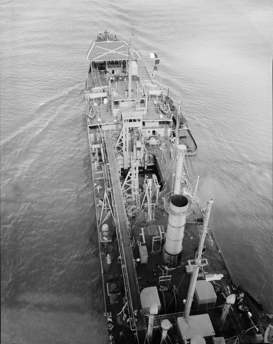 An overhead view showing the well for the transducer array and other details of the ship's layout. She is probably shown here at New Orleans before March 1961 without the array and its large support structure. Note that the kingpost to service the array and its well is offset to starboard. At the bottom of the picture are the tall exhaust stack for the gas turbine generator for the array and two low covers for the air intakes for the generator.