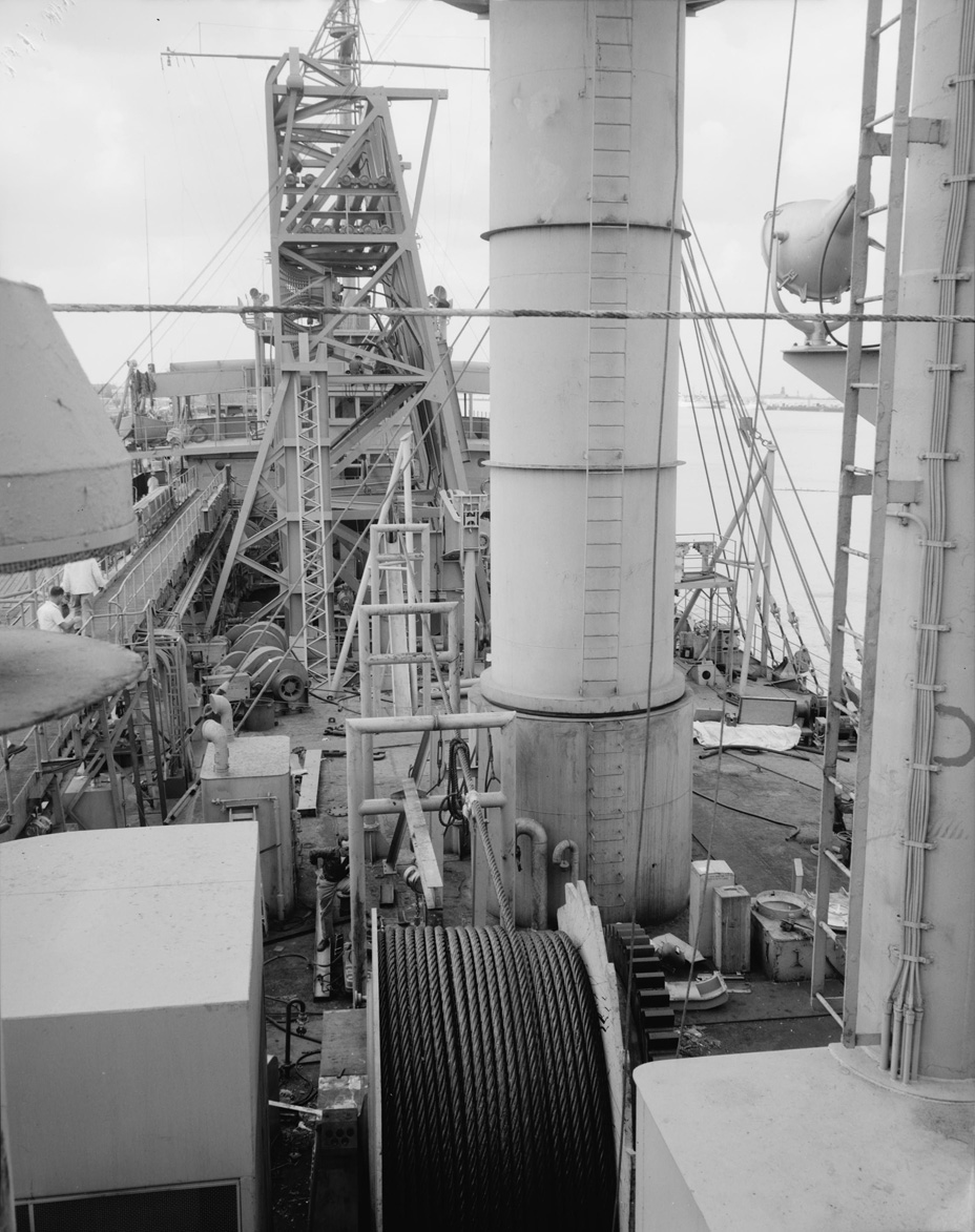 The deck forward of the bridge photographed in March-April 1961 at New Orleans showing the forward cable reel used to lower and raise the transducer array and the opening in the bridge deckhouse to allow passage of the cable back to the array.