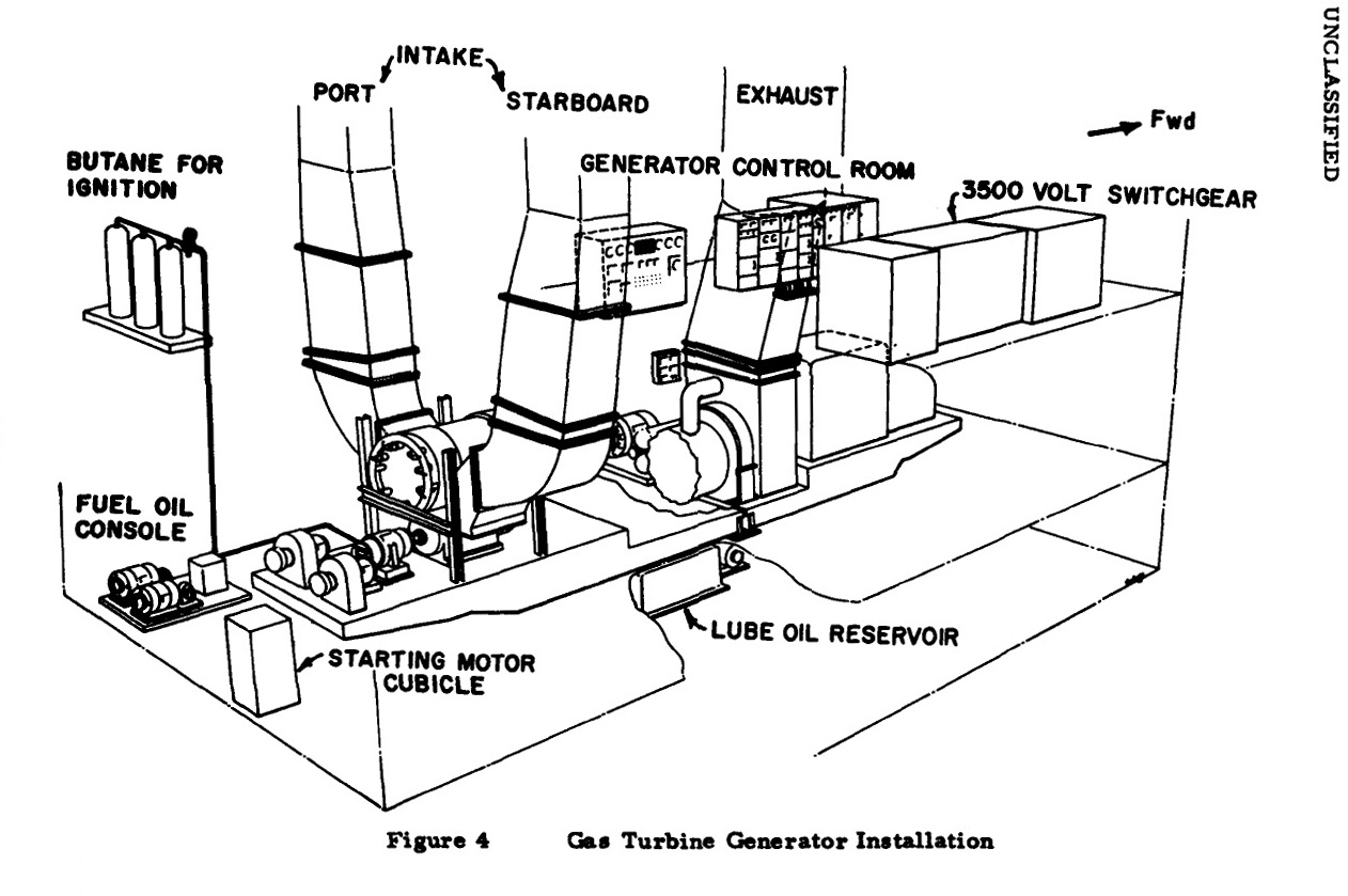 The gas turbine generator installation in the after holds which powered the transducer array. It produced enough power to furnish lights for a town of 50,000 persons. The exhaust air at the upper center of the drawing passed up the very tall stack aft of the array, while the intake air entered through two low enclosures just forward of the after mast.