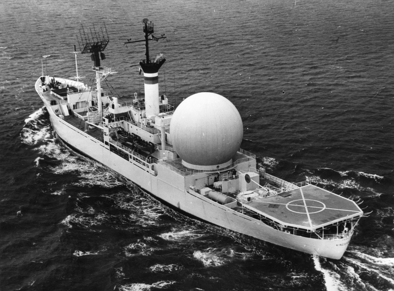 After being reconfigured in 1967 as a bathymetric and acoustic survey ship for Project Caesar (SOSUS) with the air-inflated radome and multi-element antenna removed and a tall antenna with multiple guy-wires added on the flight deck.
