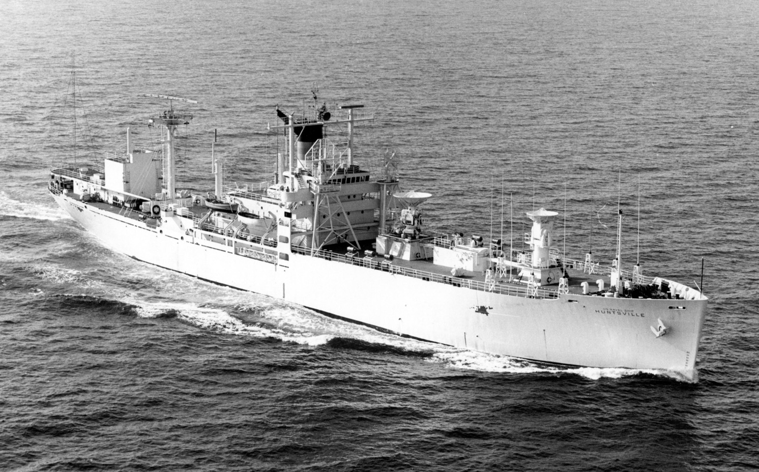 Photographed by the Pacific Missile Range on 27 March 1962. The two quadruple element tracking antennas have been replaced with a lattice dish on the masthead and a cross-shaped antenna on the cover to No. 3 hatch. A way to tell the two ships apart at this time is that Watertown had her navigation radar on the old second mast while Huntsville had hers on a platform on the tripod.