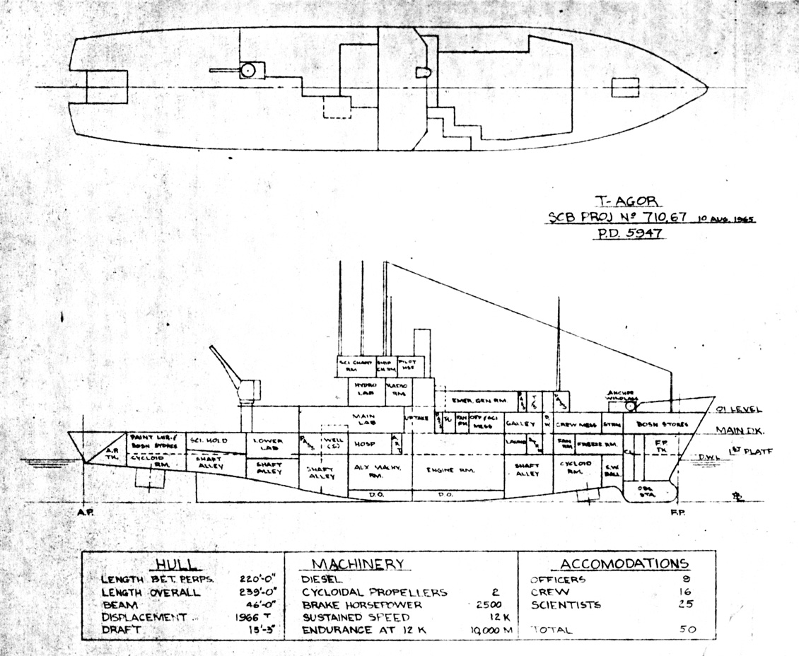 This sketch probably represents the design for the FY 1966 AGORs around 12 January 1965 when the Ship Characteristics Board distributed preliminary characteristics for the two ships with dimensions identical to those on this sketch. Except for a substantially increased beam these ships were about the same size as the Project 185A AGORs that they were to supersede. The split deck levels within the hull and the total rearrangement of the superstructure reflected the efforts to accommodate numerous recent advances in oceanographic technology in a small hull.