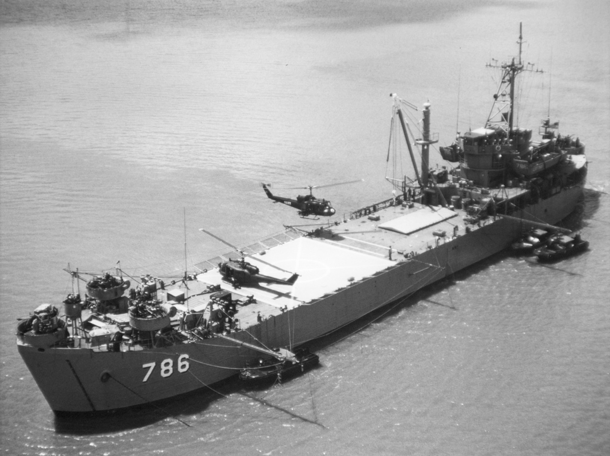 Photographed in June 1968 reconfigured but not yet reclassified as an AGP. A Navy UH-1B Iroquois armed helicopter is coming in for a landing aboard the ship which is anchored in the Co Chien River supporting Operation "Game Warden" forces.