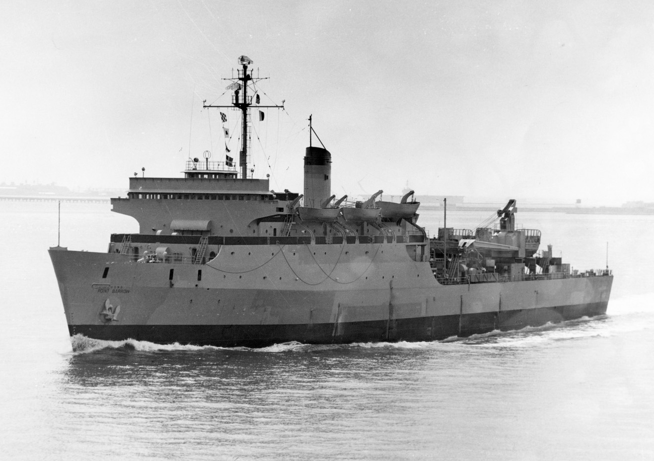 Probably shown soon after conversion to replace White Sands (AGDS 1) and Apache (ATF 67) as support ship for the bathyscaphe Trieste II (DSV-1). Note the addition of a second stack, presumably for auxiliary machinery, and two small mobile cranes on the dock sidewalls.