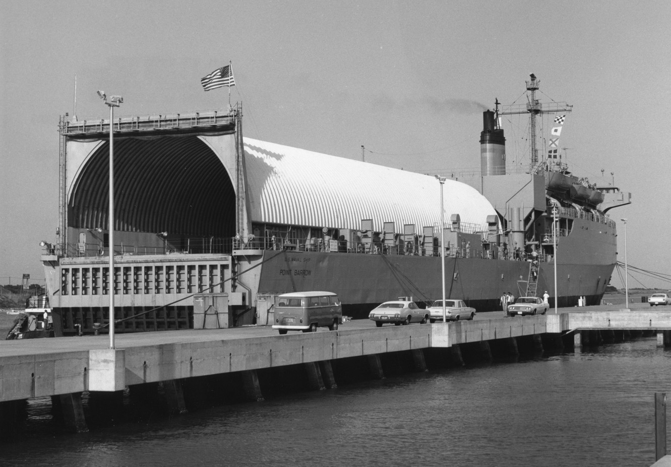 After conversion in 1964-65 at the Willamette Iron and Steel Works, Richmond, Calif., to ferry Saturn moon rocket sections from Seal Beach, Calif, to Michoud, La. (by barge from New Orleans), and Cape Kennedy, Fla. Her 202-foot dock was covered by a structure resembling a quonset hut with a nylon-reinforced neoprene curtain-type door in a rectangular frame at the after end, and she was fitted with anti-roll tanks.