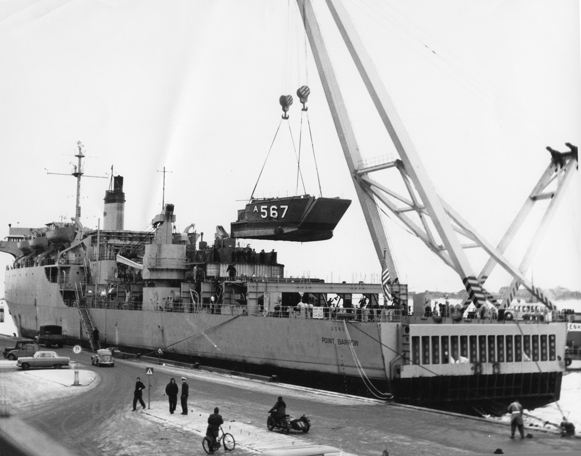 Handling utility landing craft of the Navy's postwar 115-foot LCU 1466 and LCU 1608 types, which were enlarged versons of the wartime LCT(5) type and many of which were built for the Army. The floating crane appears to have an Army "BD" number. The stern section of another LCU is on the ship's superdeck. Point Barrow made several voyages carrying LCU's from the U.S. to the Far East.