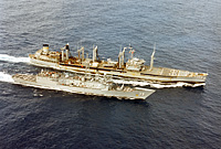 Underway in February 1991 during exercises off the coast of southern California. The single fueling station forward of the bridge was removed from this class at around this time to clear more room on the bow for helicopter operations.