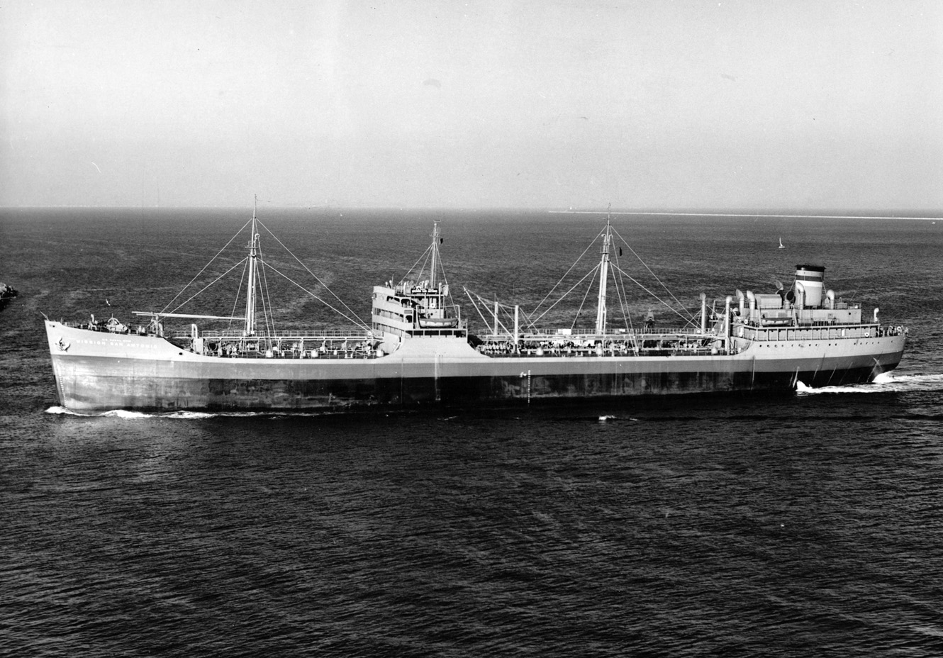 Underway as a U.S. Naval Ship during the 1950s with the San Pedro Bay breakwaters in the background and with harbor tugs from San Pedro assisting. She was the last T2-SE-A2 built with Marinship's original small stack.