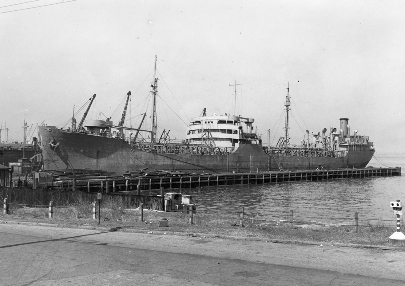 Underway as a U.S. Naval Tanker in 1948-49 near the seaward end of the main channel between San Pedro and Terminal Island. The Long Beach Naval Shipyard is visible in the far distance over the Quonset huts on the right. A San Pedro harbor tug is assisting.