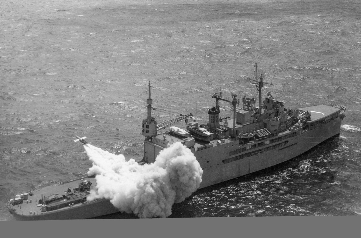 Photographed in November 1966 by the U.S. Naval Missile Center, Point Mugu, after removal of the TYPHON system. The spacious 05 level over the bridge was retained along with the old TERRIER twin arm launcher. The SEA SPARROW basic point defense surface missile system launcher, which was on the extreme stern, is absent here.