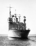 At the First Fleet Review at Long Beach, Calif., on 14 September 1956 with USS Inflict (MSO 456) passing behind her. Norton Sound now has the AN/SPQ-5 TERRIER beam-rider guidance radar over the bridge that was also used in the first TERRIER combatant ships. Her last 5"/38 gun was removed around this time.