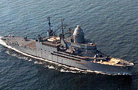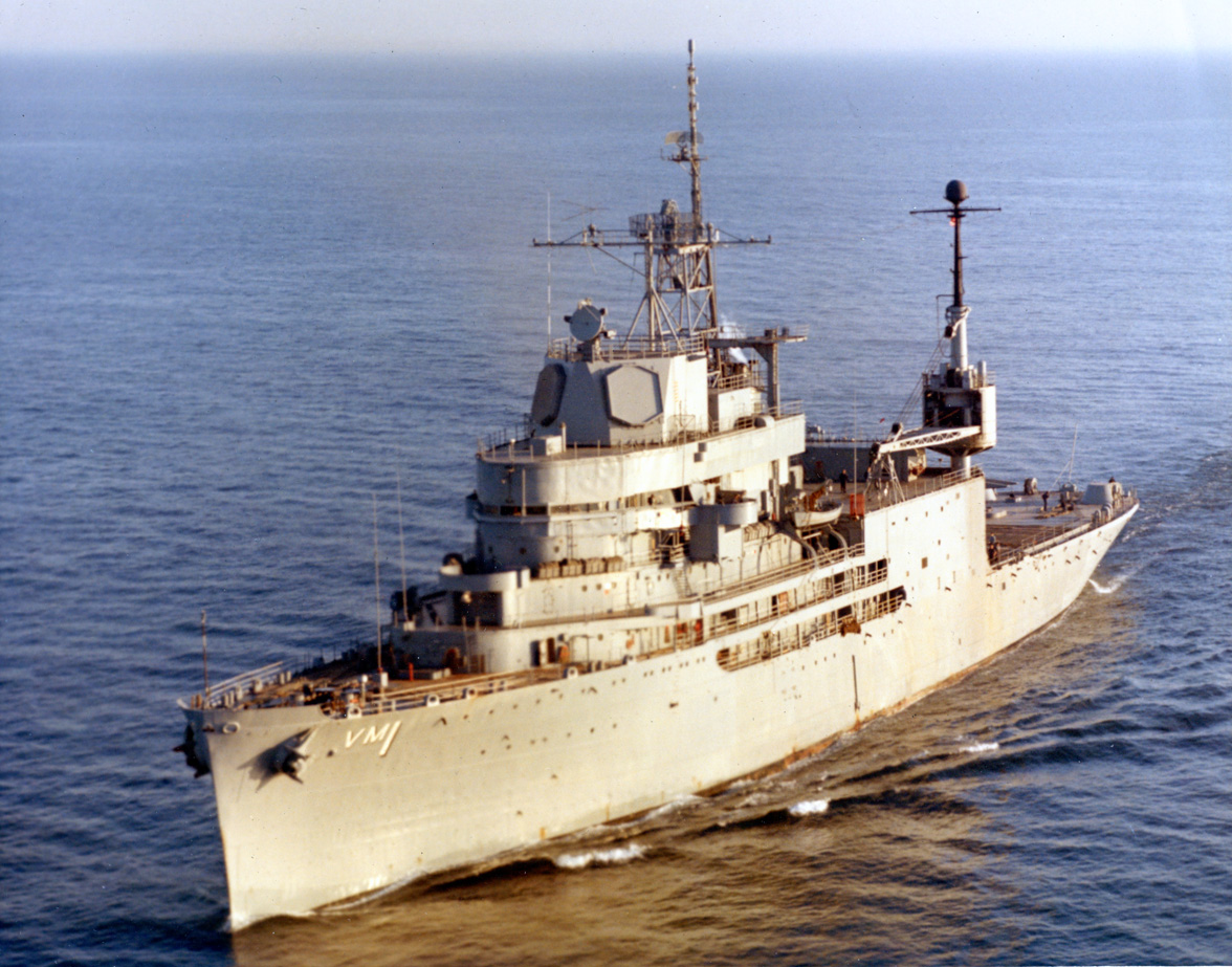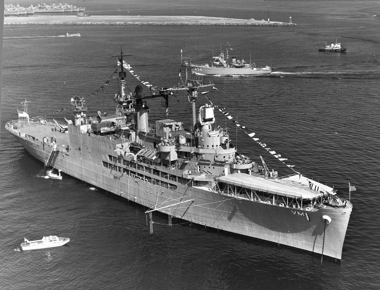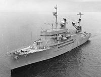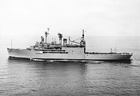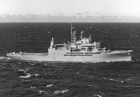 Photographed circa October 1981 by the U.S. Naval Missile Center, Point Mugu, with a missile vertical launch system (VLS) newly installed under the rectangular hatch fitting on the forecastle. The ship's last seaplane tending crane has been removed, although its vertical portion remains as an antenna mast.