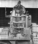 An artist's rendering of the TYPHON radar dome similar to the one on Norton Sound in 1964. The radar proper consisted of the conical top with five spherical Luneberg arrays, one at the top for transmitting and four around the sides for receiving. "Inside the many microwave connections of waveguides, feedhorns, switches, and other components give the appearance of 'microwave spaghetti.'" (Gussow)