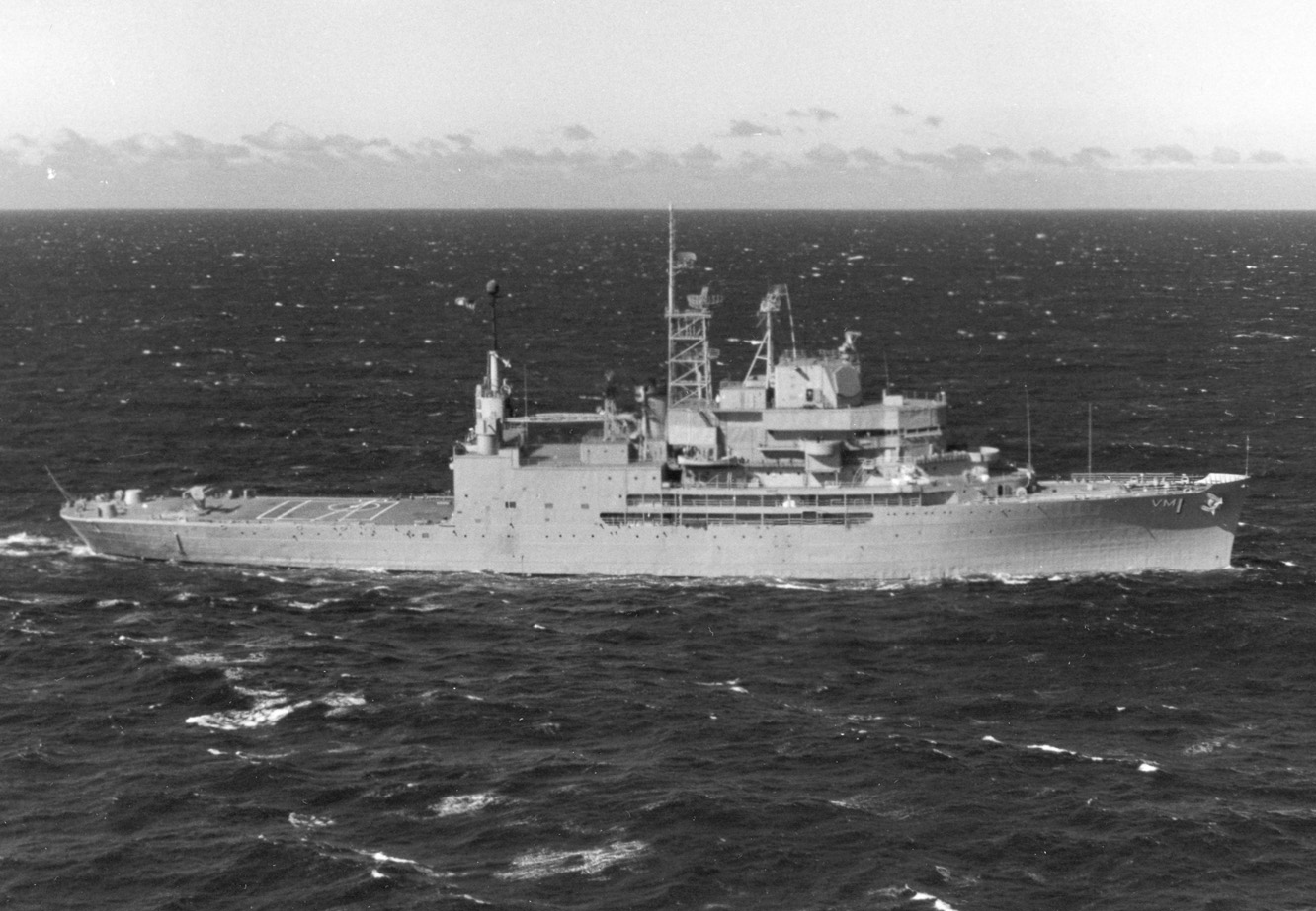 Underway on 14 October 1964 after her two year TYPHON conversion at the Maryland Shipbuilding and Drydock Co. in Baltimore. Note the tower for the AN/SPG-59 electronically scanned phased array radar that was part of that combat system.