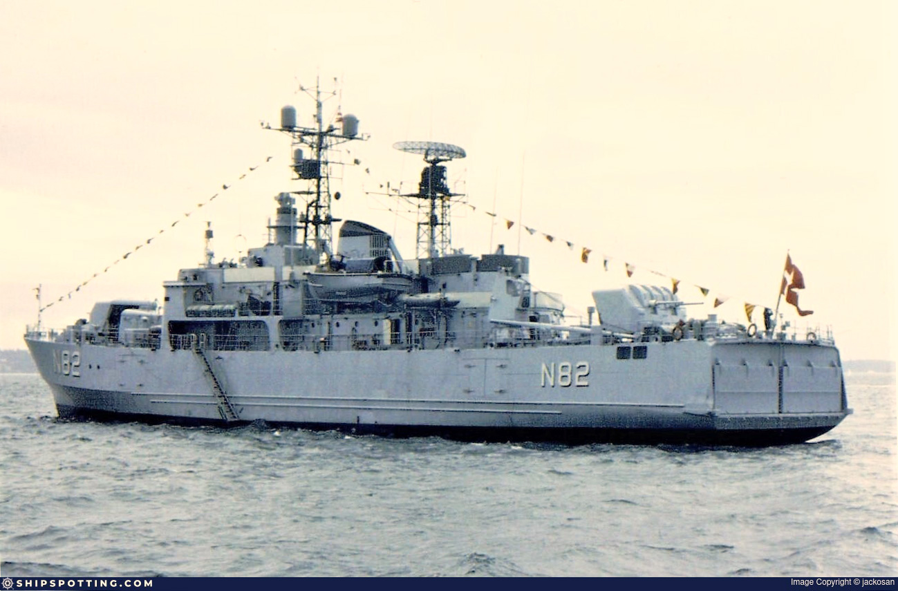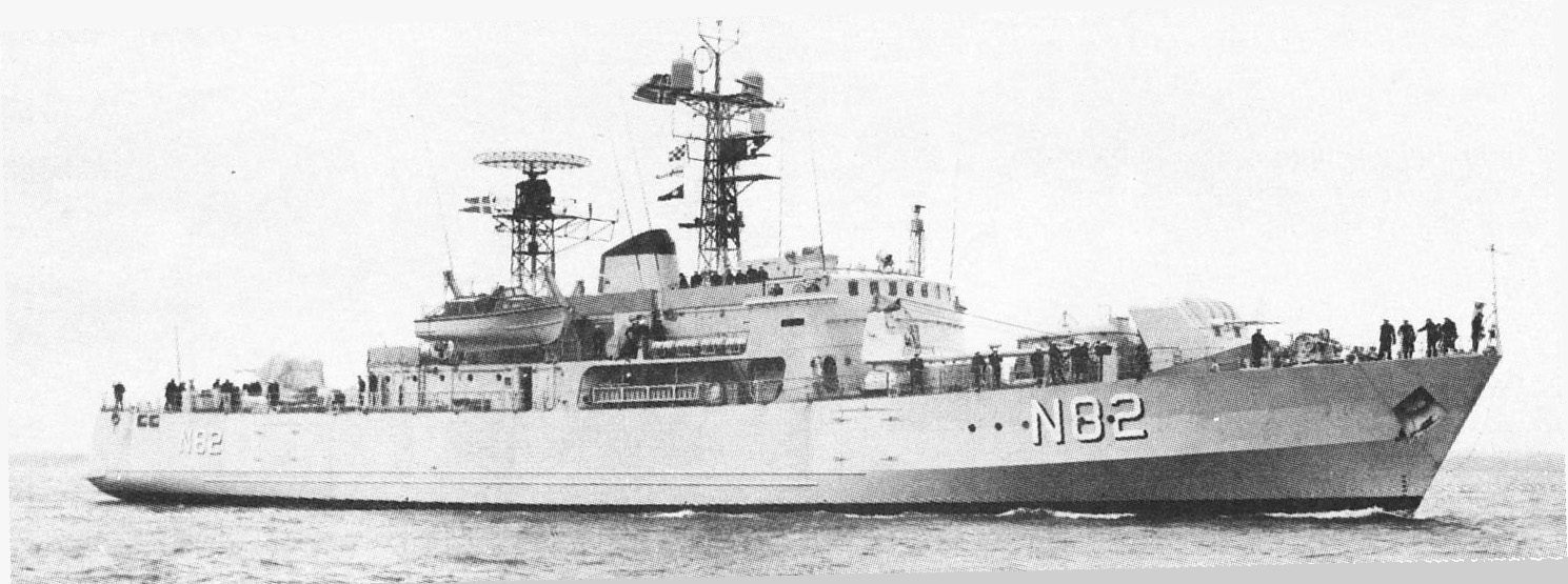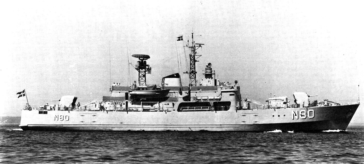 In a Royal Danish Navy photo circa 1970. The platform over the bridge for her gun fire control system has been raised.