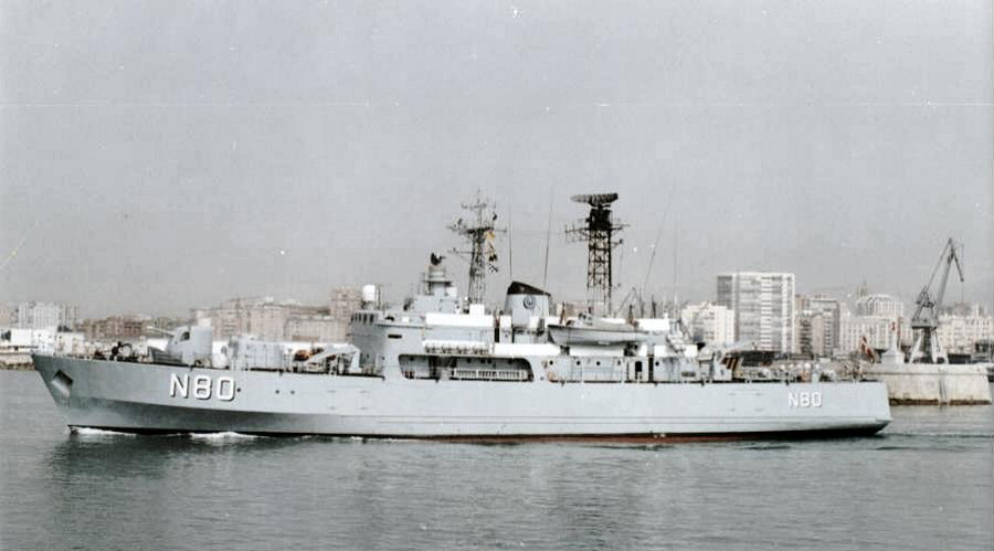 At Malaga, Spain. The radar mast was raised between 1990 and 1993 and the after twin 3"/50 mount was removed in 1993-94.