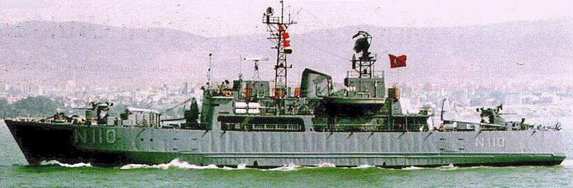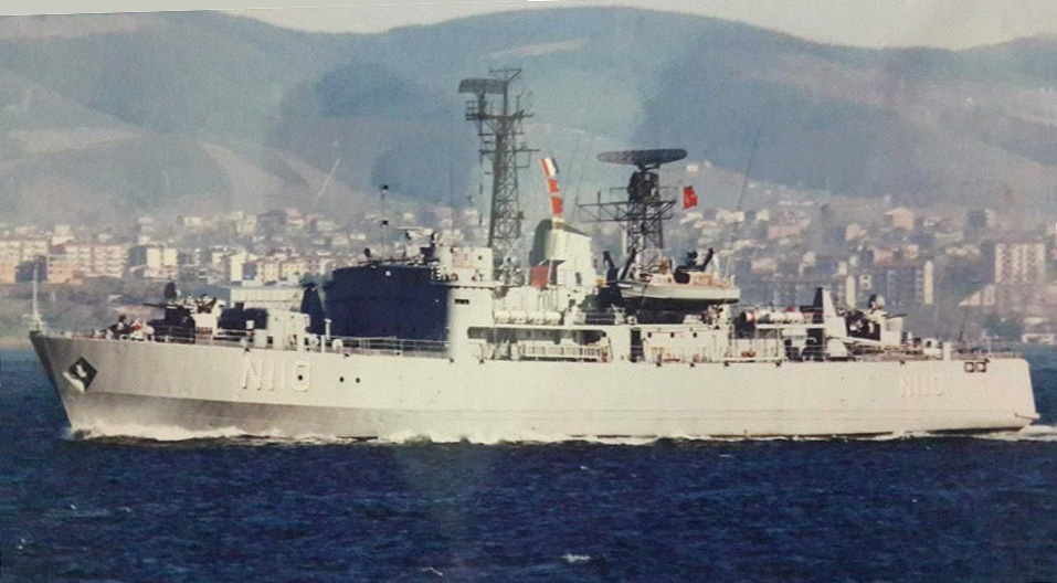 Shown after changing her NATO pennant number from N108 to N110, probably in the Bosporus. Her 3"/50 gun mounts lack shields.
