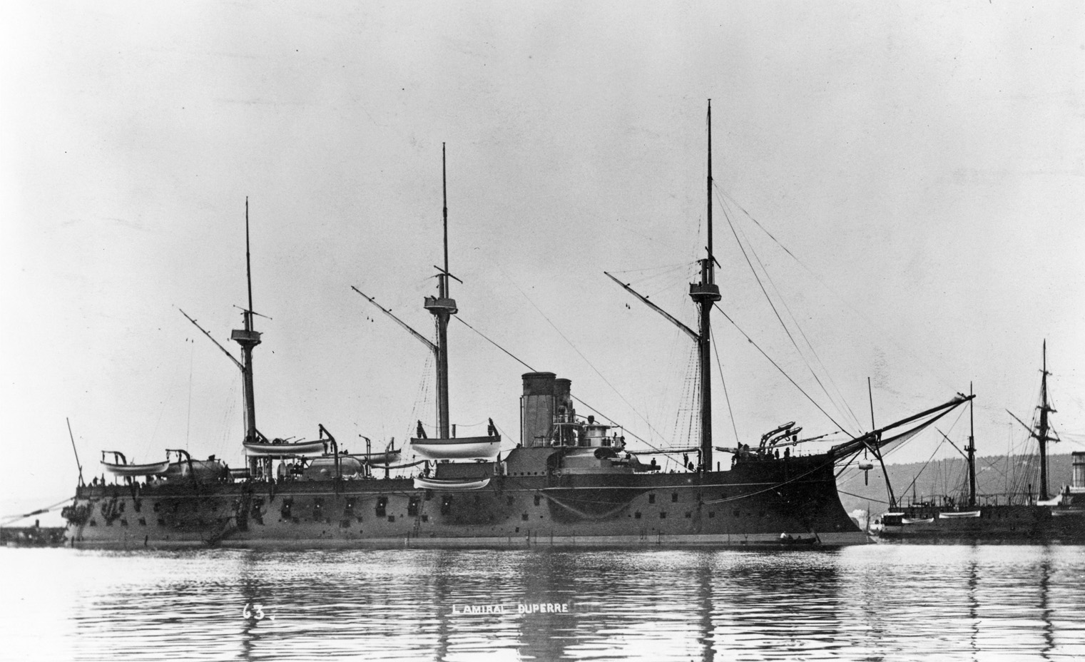 Amiral Duperré (1st rank ironclad), as commissioned in 1883 with a light fore-and-aft rig instead of the full ship rig in the original design. Redoutable is in the background to the right. (Photo: NH 74901, from ONI album of foreign warships)