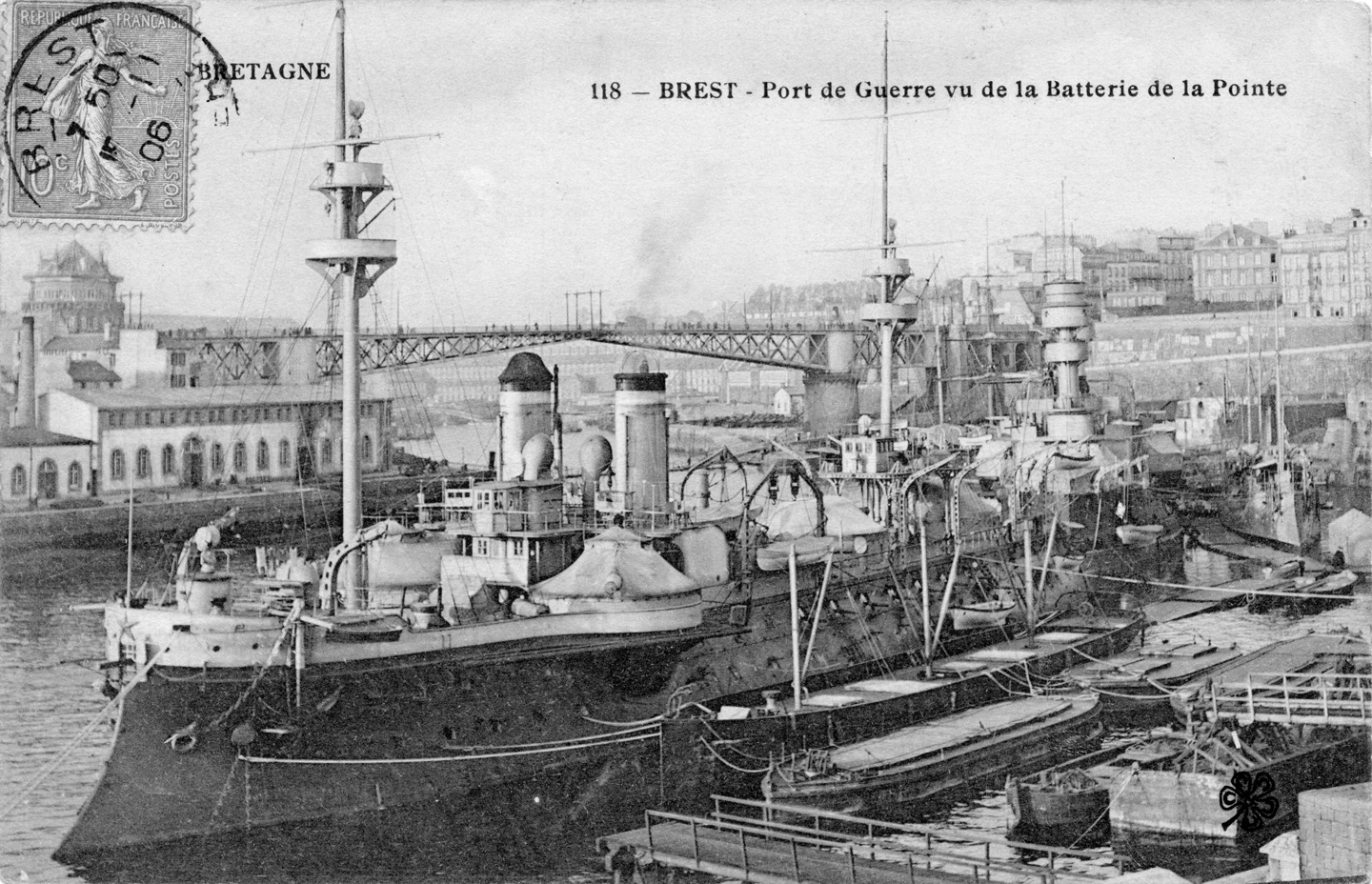 Neptune (Squadron battleship) while inactive at Brest between 1899 and 1905. Amiral Duperré is at the upper right showing the shields on her after main battery guns and Saône (not shown) was astern of Neptune. (Photo: Postcard by Villard, Quimper)