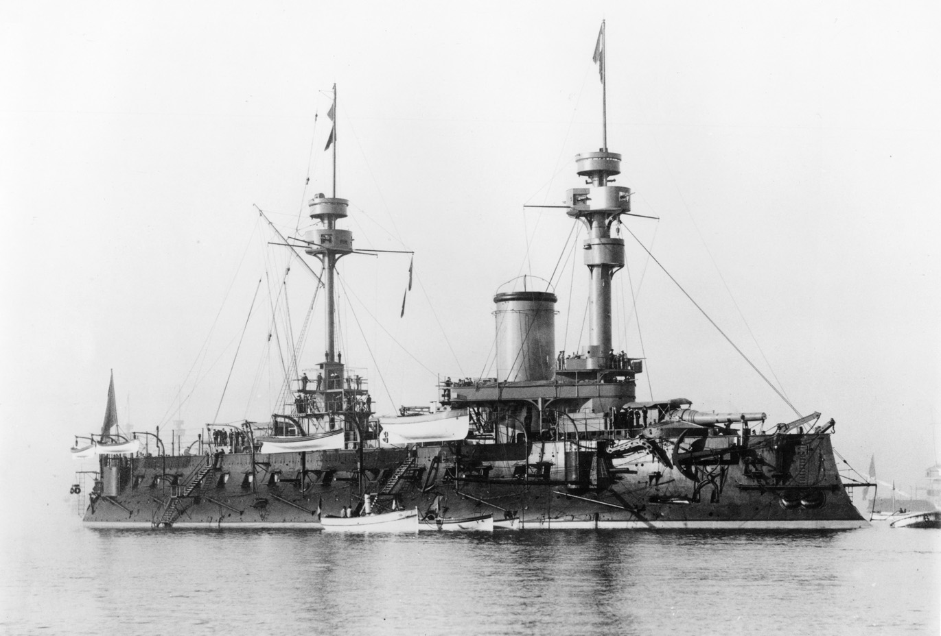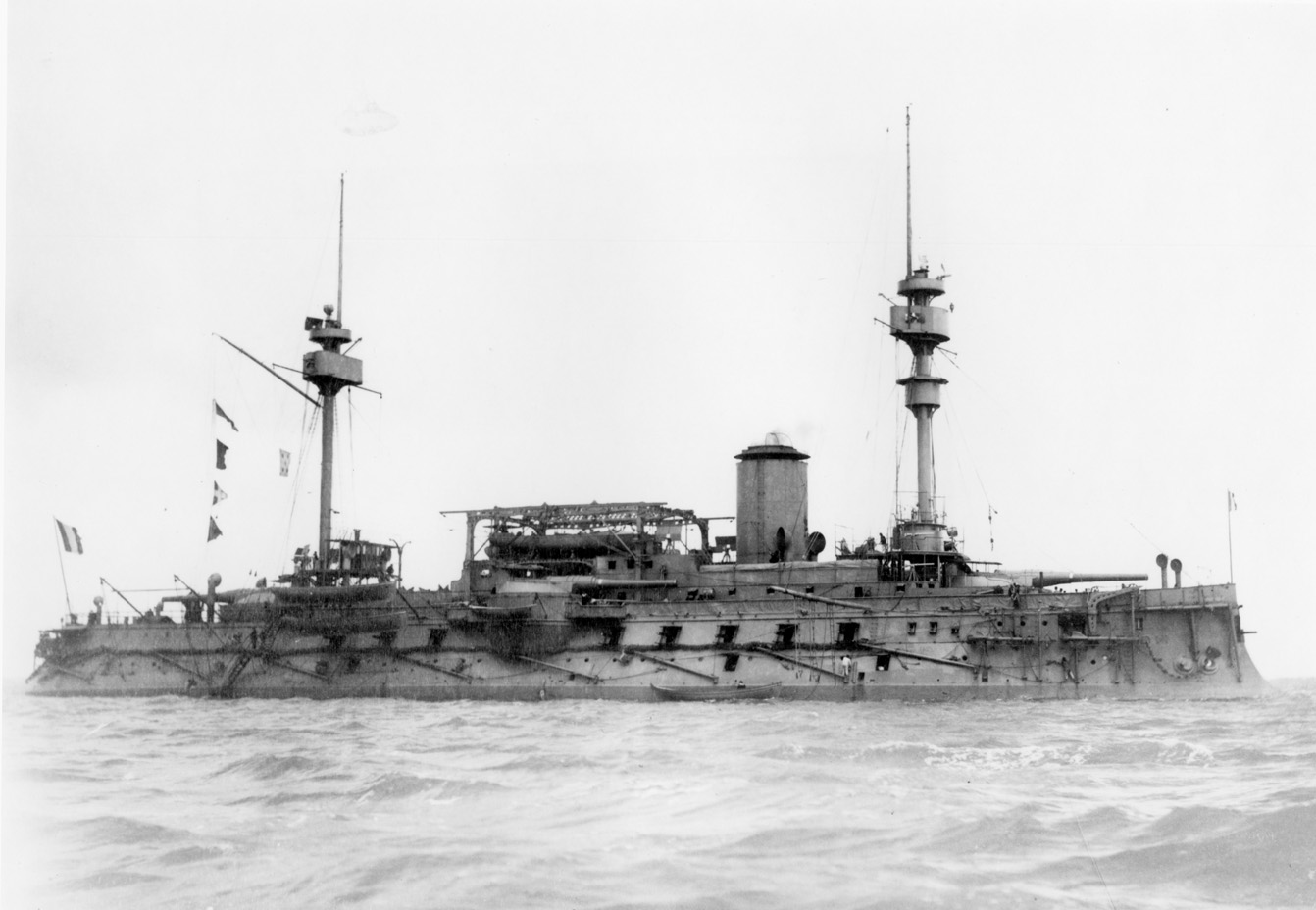 Hoche (Squadron battleship) as completed. The superstructures piled high on a low hull caused her to be called informally the "Grand Hotel." Note the donjons (round galleries) over all four main battery guns and the Bullivant torpedo nets on the hull. (Photo: NH 88812, photo by ND received by ONI on 1 June 1891)