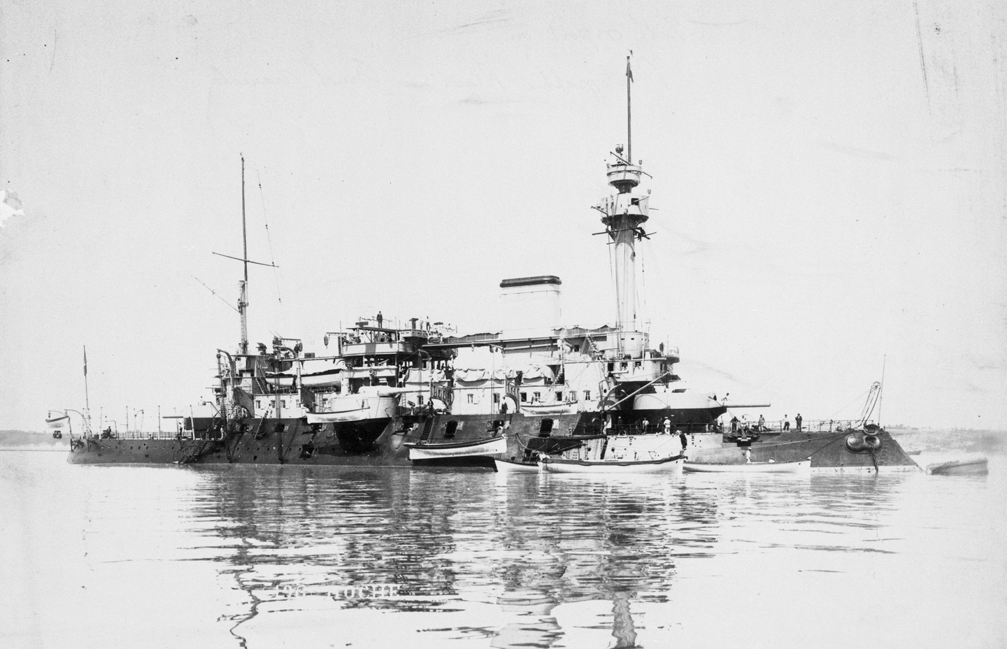 Hoche (Squadron battleship) at Toulon after the removal of the remnants of her donjons in 1907 by the ship's crew with dockyard help. She was placed in reserve in 1908 and sunk as a target in 1911. In her last years she was classed as a squadron battleship in the second line fleet, not as a coast defense ship as captioned here. (Photo: Postcard by Petit Provençal, Toulon)