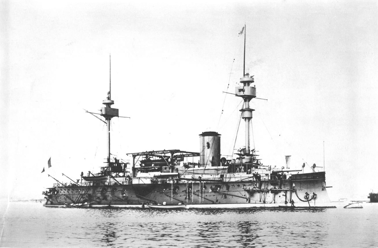 Formidable (Squadron battleship) as completed. The upgrade to a full military foremast was approved in February 1887. Protective covers (carapaces) for her main guns like those in Amiral Baudin were approved in July 1888, but this view appears to show an earlier type. (Photo: xpng)