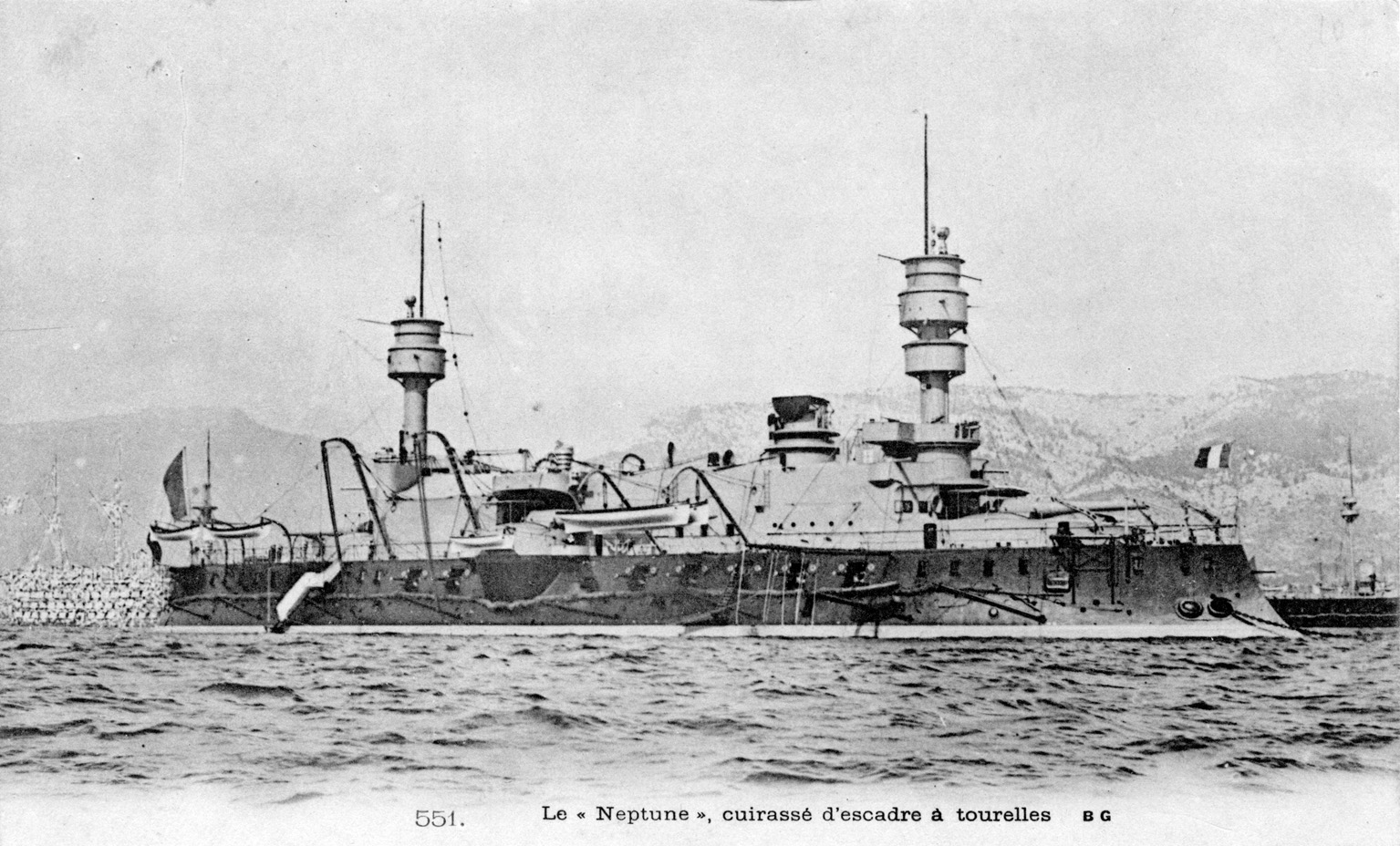 Neptune (Squadron battleship) at Toulon between 1893 and 1898. The upper level of her main top was removed in around 1898. (Photo: Postcard by B G.)