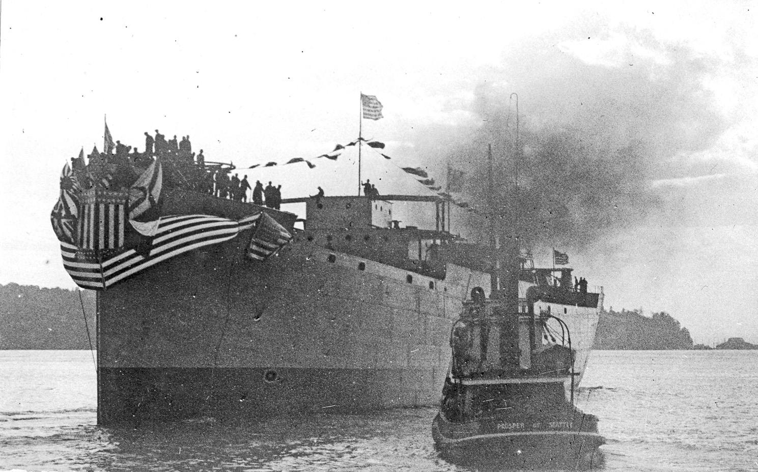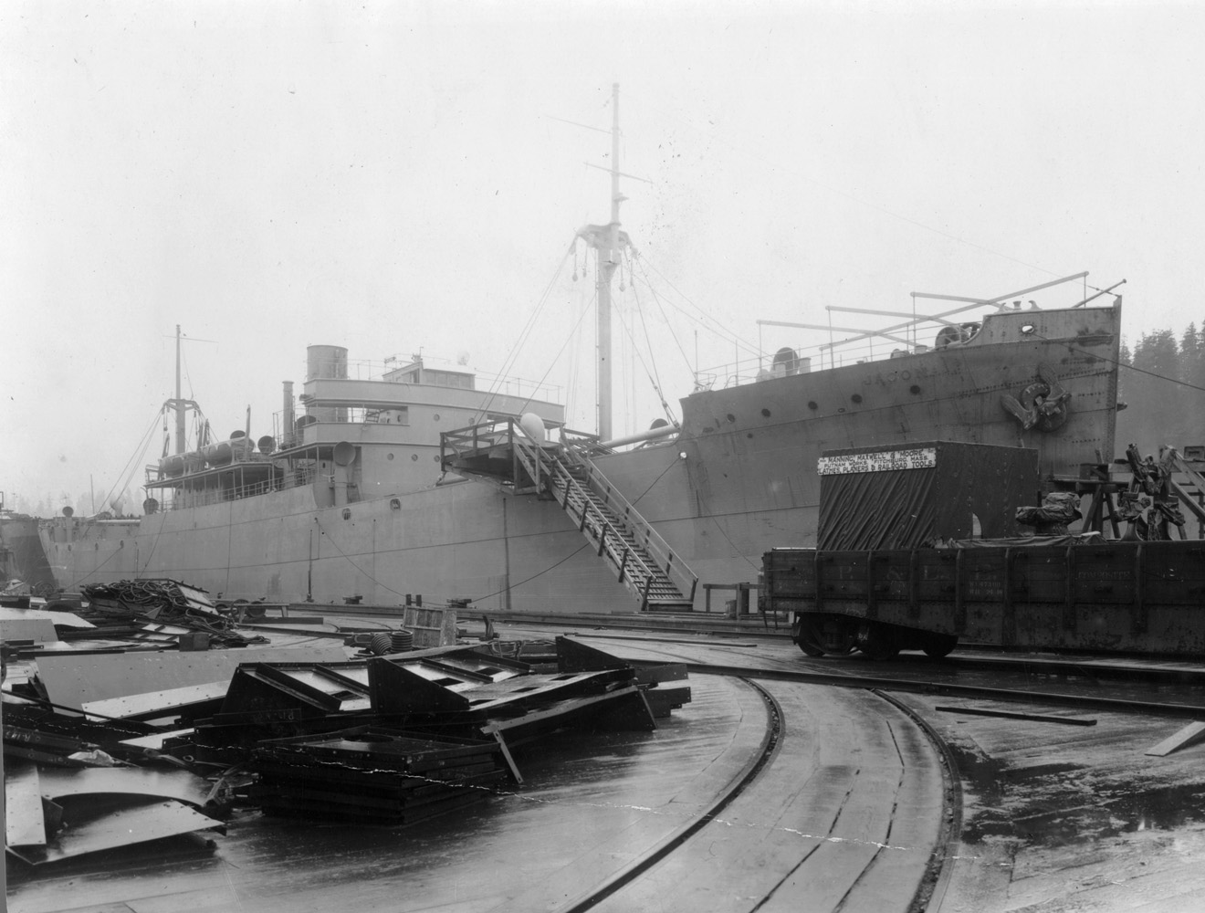 | S.S. Jacona (Design 1014, EFC Hull 111) fitting out on 25 January 1919 at the Todd Dry Dock and Construction Co., Tacoma, Wash. This ship had the unusual fate of being converted to a non-self propelled power plant at Newport News in 1930. After serving in Maine and New Hampshire she became an Army ship in 1945 and the Navy's YFP-1 in 1947. She was reportedly still in excellent condition when transferred from the Navy to the Philippines in 1971. (NARA: RG-32-UB) (Click photo to enlarge) |