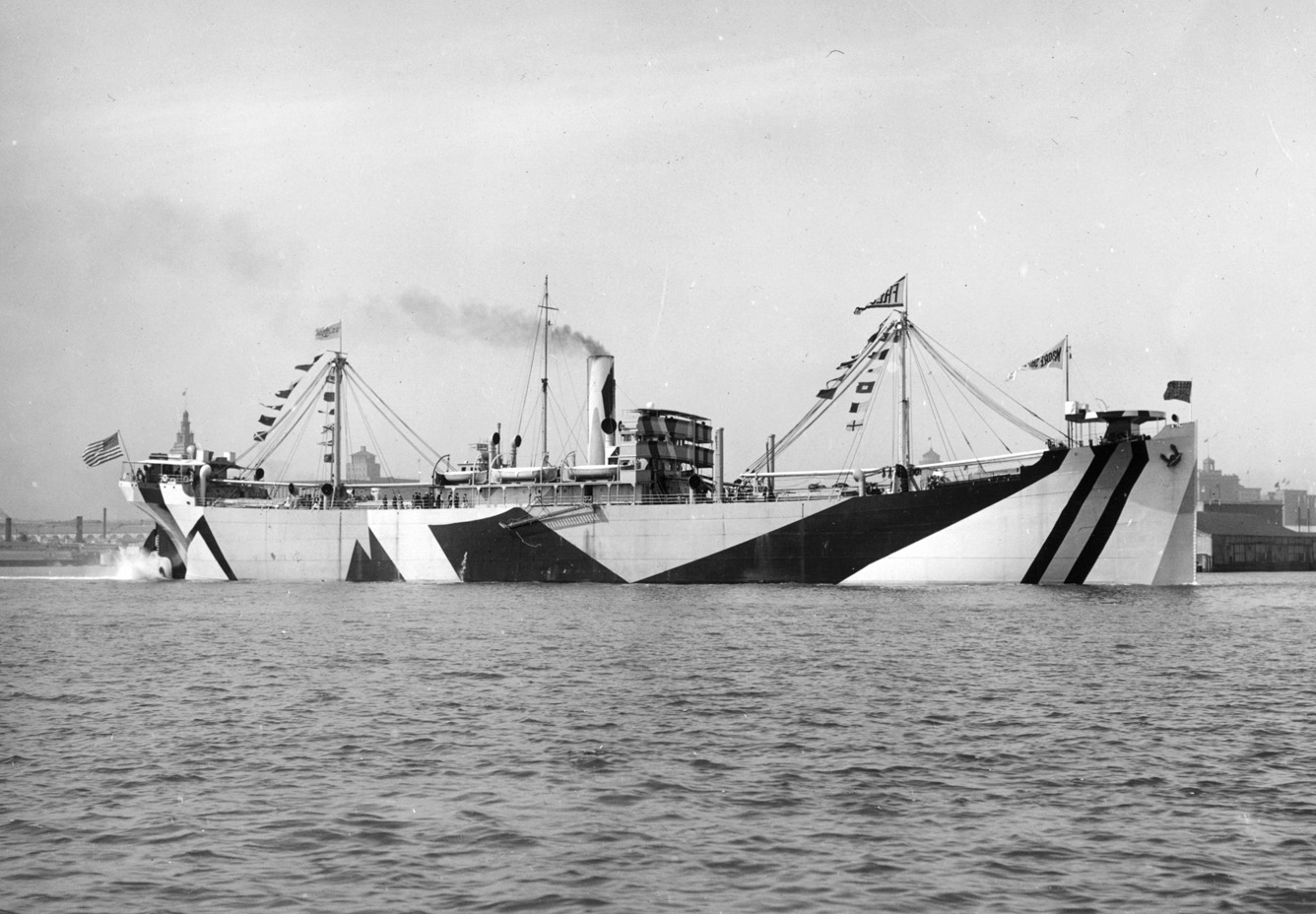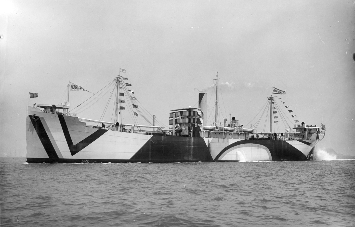 On a trial trip on 20 June 1918 after construction by the Moore Shipbuilding Co. Her original British name was War Coast. The dazzle camouflage introduced at this time was later called by the The Morning Oregonian in a different context a "fantastic decorative effect," even more so than shown in the photos as it employed many colors.