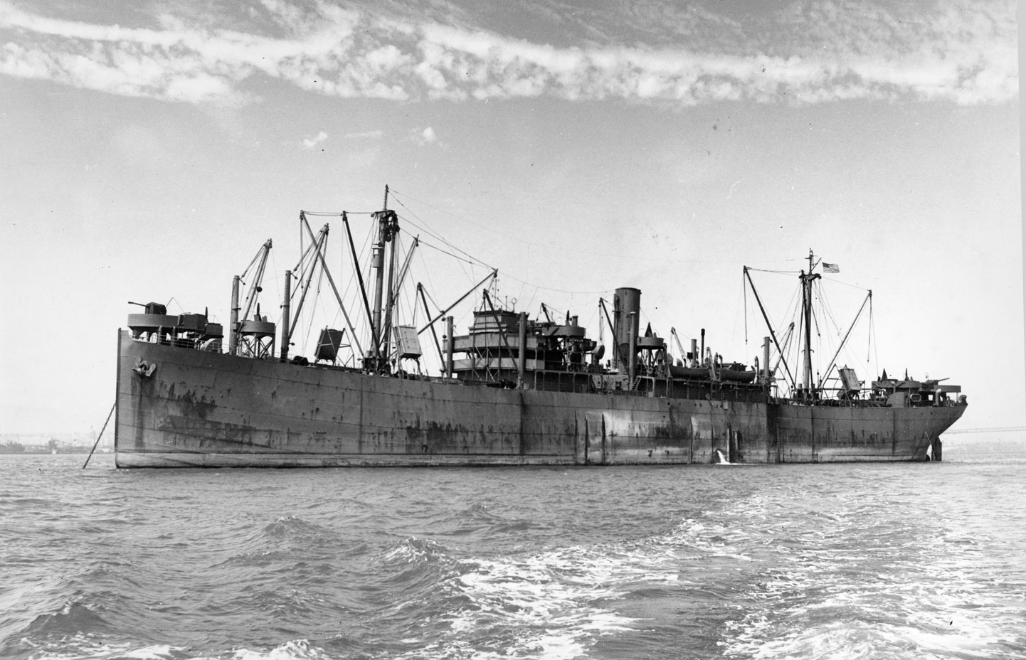 Probably photographed at San Francisco in late 1945 after war service in the Pacific. The three extra pairs of kingposts were probably fitted by the American Hawaiian Steamship Co., which bought the ship in 1929 and whose ships tended to have large numbers of kingposts.