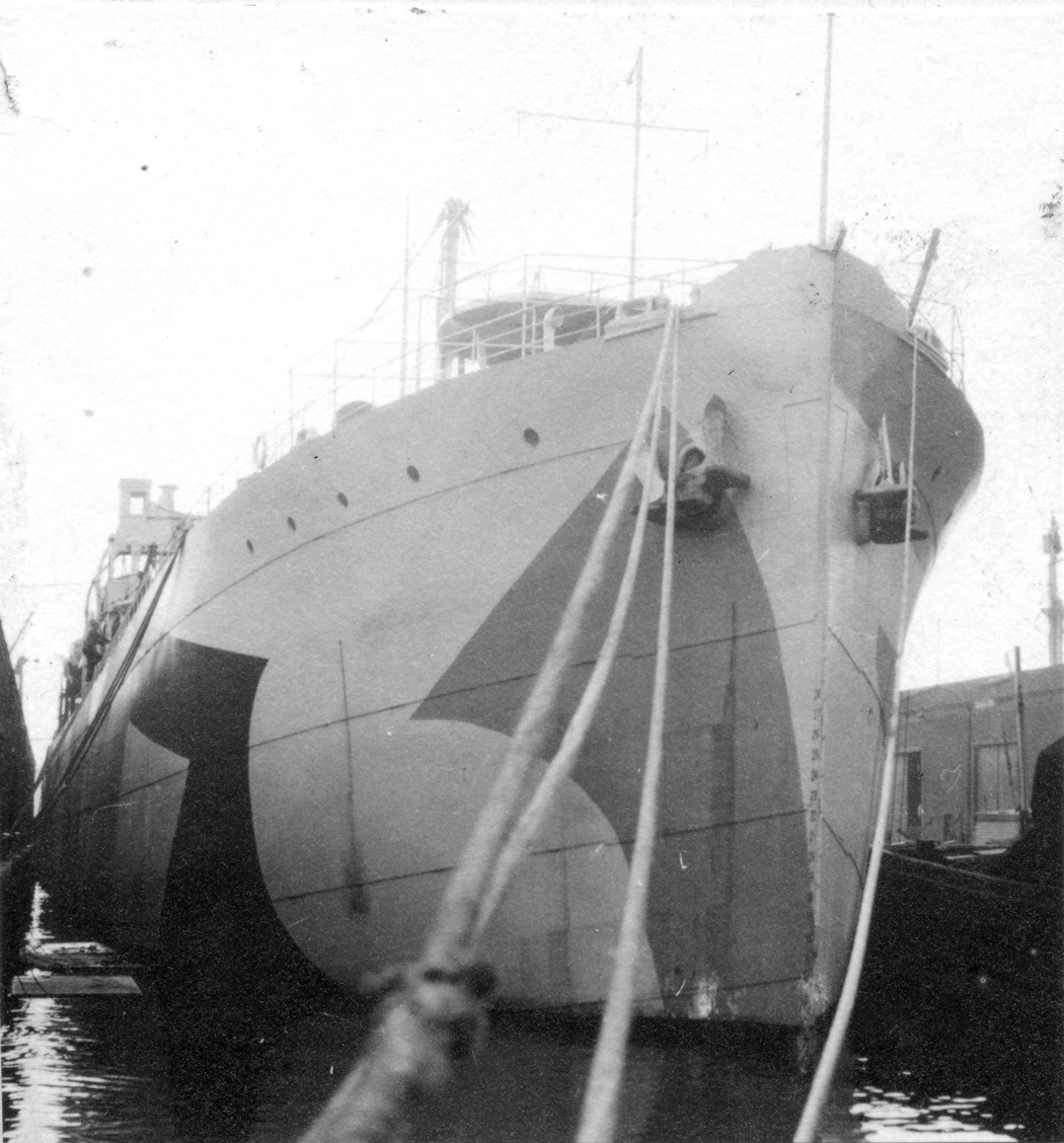 Pierside with peacetime markings painted out.