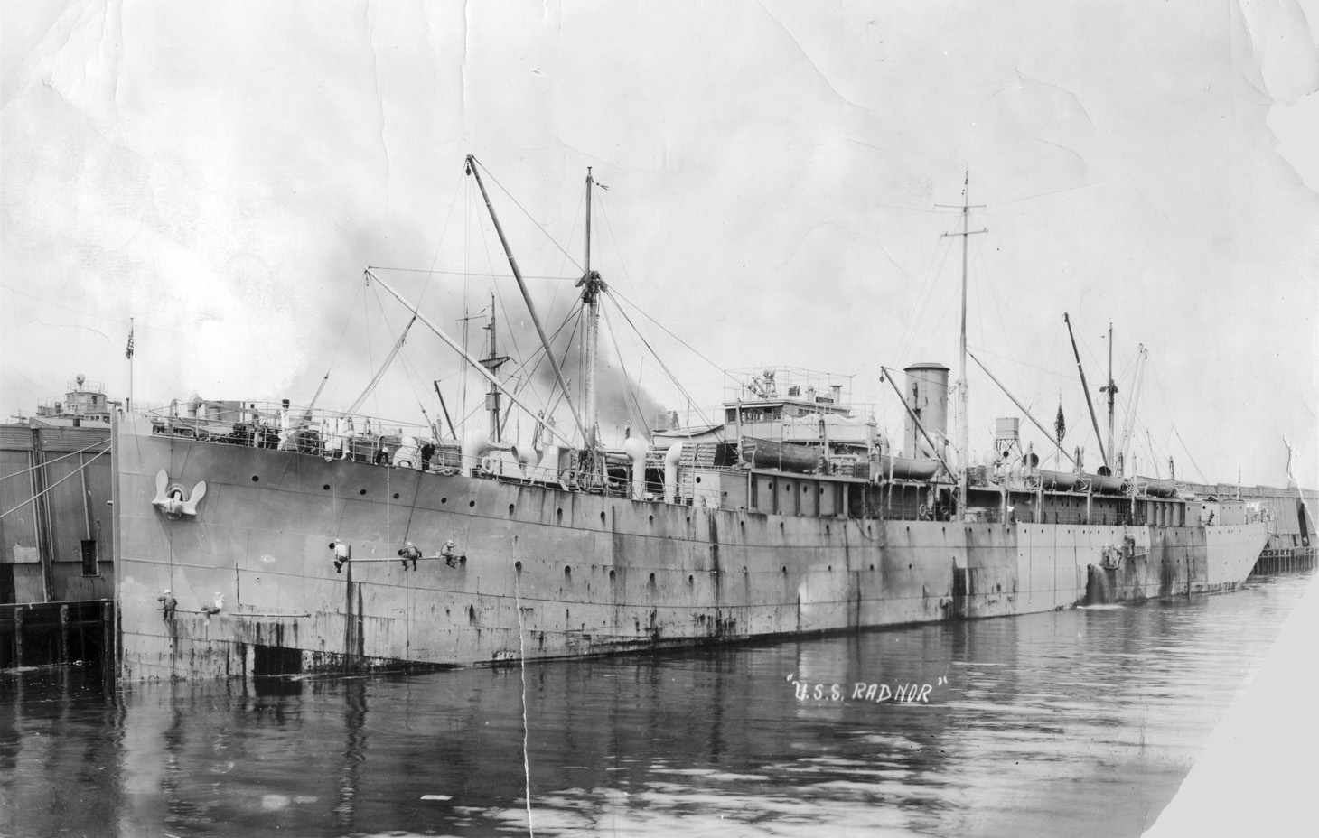 This requisitioned ship operated as a Navy cargo ship between July and December 1918. She then joined the Cruiser and Transport Force on 17 December 1918 to help bring troops home from Europe, was converted to a troopship, and is shown here embarking troops at American Bassens, France, on 16 May 1919. Like Radnor she was decommissioned in October 1919.