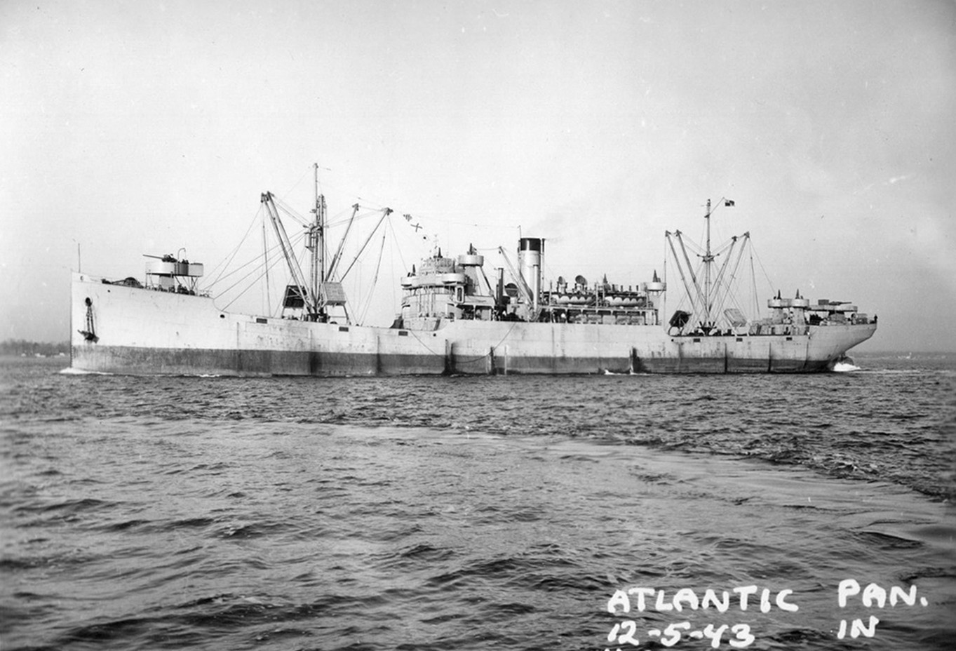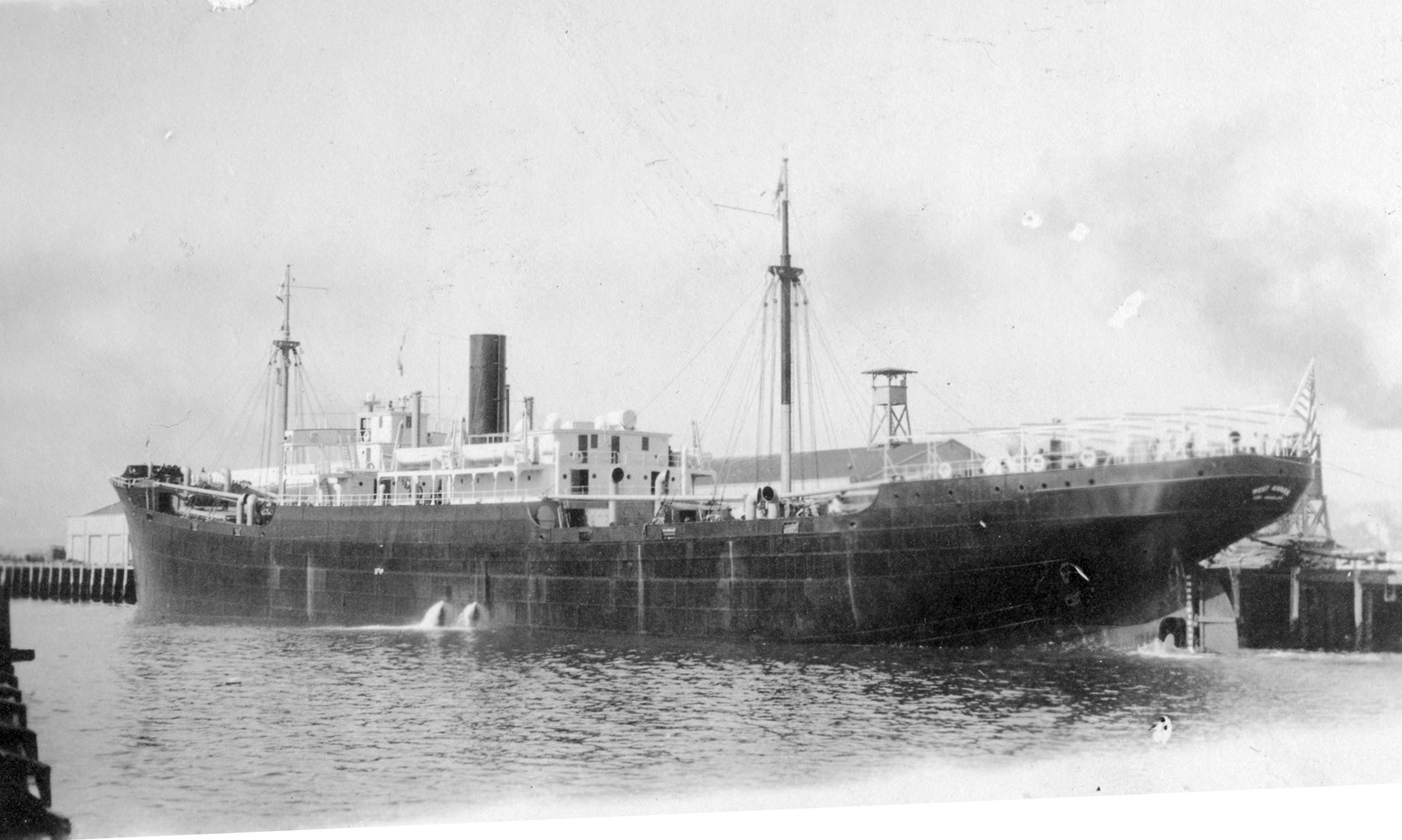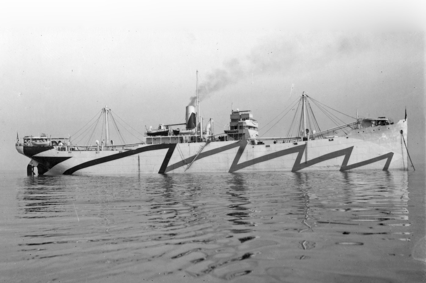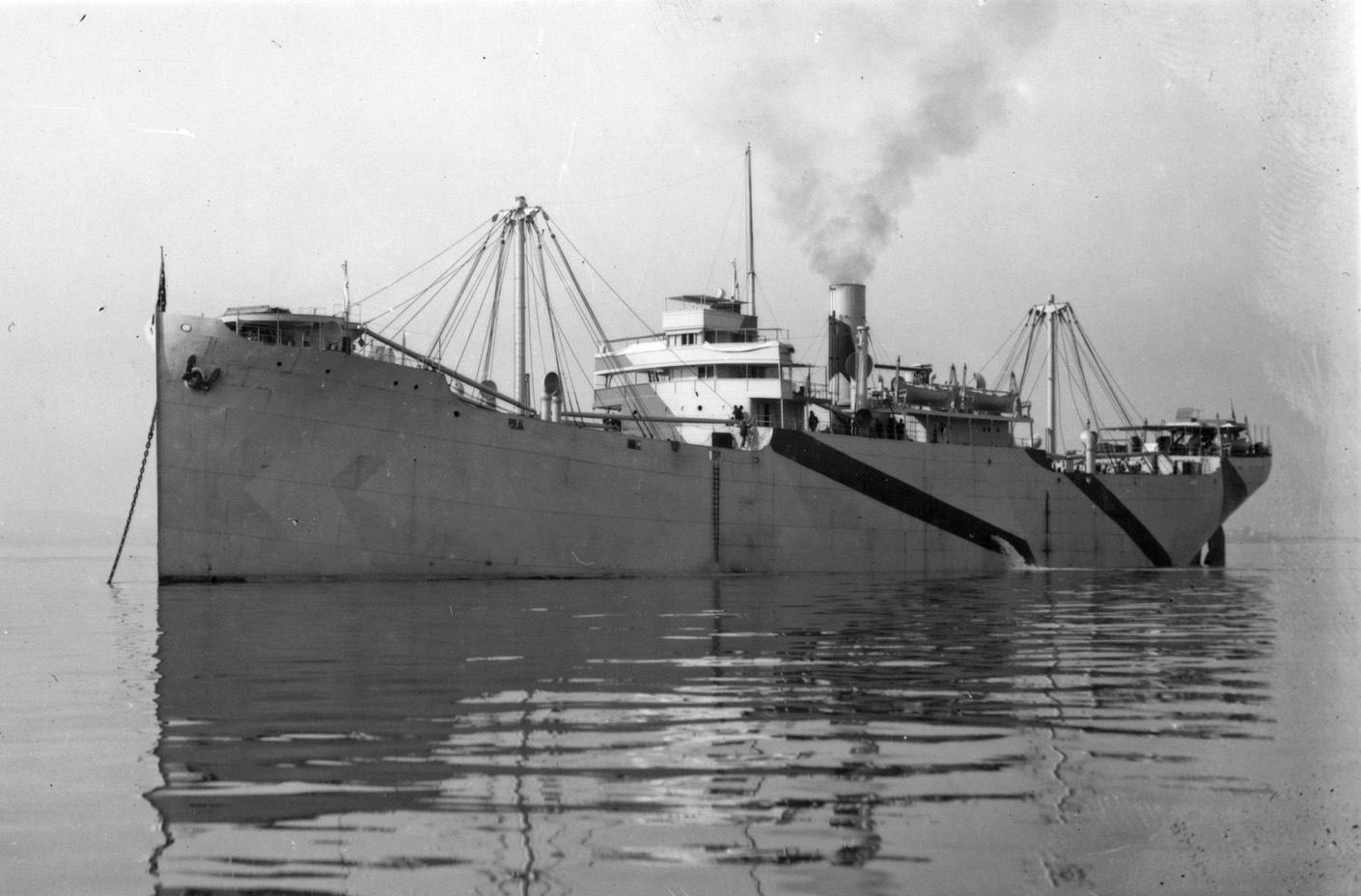 | S.S. Nantahala (Design 1019, EFC Hull 335) on trials on 30 October 1918 after construction by the Western Pipe & Steel Co., San Francisco, Cal. Note the wartime rig with a single telescoping topmast stepped on one of the derrick posts near the stack and the unusual starboard side camouflage pattern. (NARA: RG-32-S) (Click photo to enlarge) |