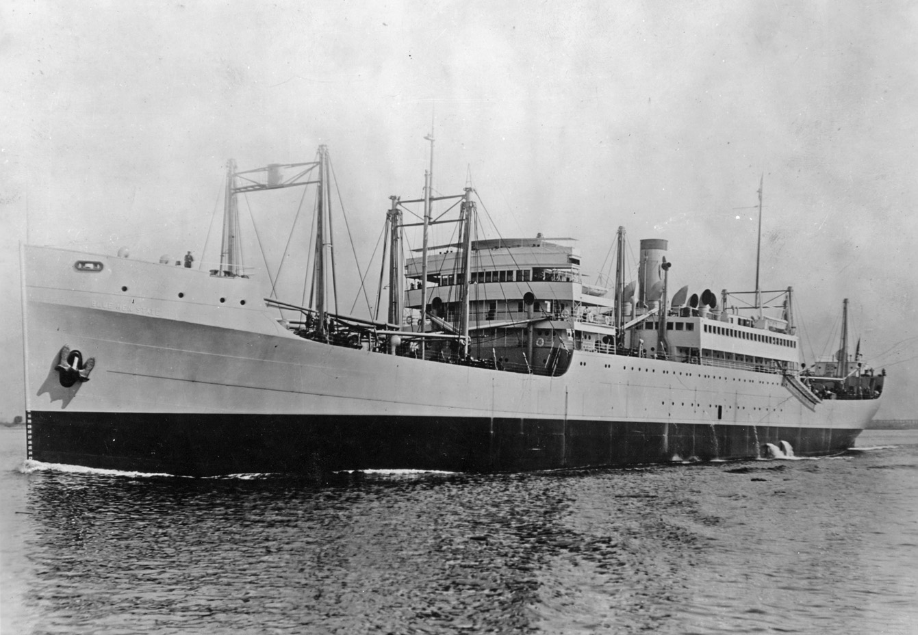 | S.S. Blue Hen State (Design 1095, EFC Hull 2591), the seventh and last of her type, was delivered on 6 July 1921 by the New York S.B. Co., Camden, N.J. With her allocation to an operator uncertain, she carried very few lifeboats and wore EFC livery with the USSB shield on her funnel when she left the yard for Hoboken, N.J., where she was painted grey all over and temporarily laid up. (NARA: RG-32-UB box 34) (Click photo to enlarge) |