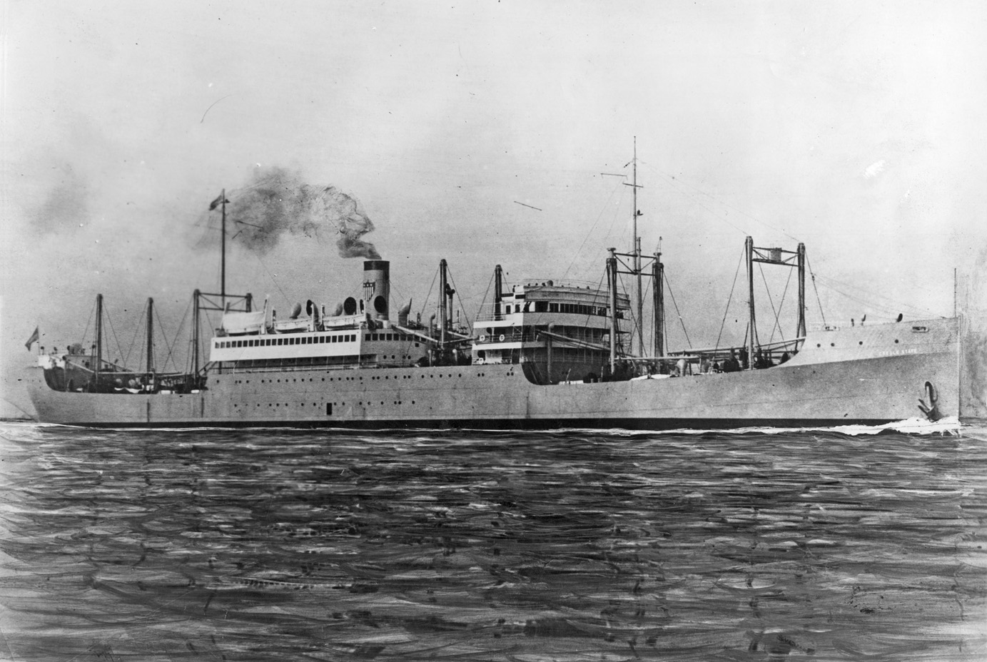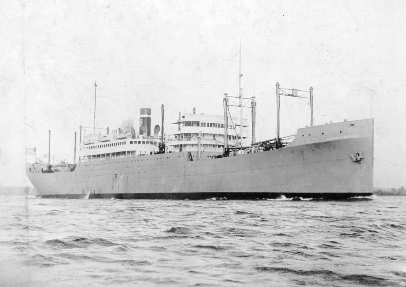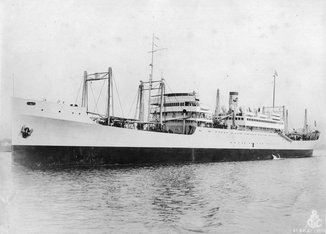 Notes: The first wartime announcement by the Shipping Board and the military on the troopships to be built by the EFC was that they would be limited to two specific designs: a big, fast 13,000 tonner able to carry 3,500 troops at 18 knots and an 8,500 tonner that could carry about 2,300 men at 15 knots. The smaller one became the Design 1024 Hog Island Type B (q.v.), the larger became the 535-foot long Design 1029. The first five Design 1029 ships were ordered in December 1917 beginning with three from the New York Shipbuilding Co. in Camden, N.J. As related at greater length on the Design 1029 page, the German all-out spring offensive begun at Cambrai on 21 March 1918 caused President Wilson to direct the Shipping Board to "go the limit" in its ship construction effort. On 1 July 1918 New York Ship received Contract 418 SC for seven more troopships (EFC Hulls 2585-2591). It probably planned to build these in its new "Middle Yard", which consisted of two twin 600-foot ways (4 slips) that had begun producing ships in December 1917. The ships of Contract 418 SC, however, were not built to Design 1029 (the "535") but to a new Design 1095 (the "502"). (Oddly the 535 foot measurement was length overall while the 502 was between perpendiculars.) New York Ship returned to Design 1029 in contracts of August 1918 for six more troopships, four to be built in a planned "South Yard" that was specifically designed to build "535"s and two in its original "North Yard". The circumstances that resulted in the development of the new 502-foot design are not totally clear. Its design number, Design 1095 can be dated to between June and August 1918 based on the dates of designs with lower and higher numbers. In its final form Contract 418 SC of 1 July 1918 (perhaps as signed a few weeks later) was an order for seven 502 foot long steel passenger/troop ships of 15,500 tons displacement and 6,000 hp. It may have been in mid-1918 that the Shipping Board and New York Ship asked the shipyard's chief naval archictect, E. H. Rigg, to develop a version of the "535" that would be less expensive to build. Thanks to a reduction in the speed requirement from 17 to 14 knots, which allowed elimination of half of the propulsion plant, and a reduction in the number of troops to be carried from 3,500 to 2,700, Rigg and his colleagues could probably have scaled down the "535" to produce the "502." It was still a troopship, and this is probably the design of a "Twin-Screw Troopship of 13,000 Tons D.W." that was published in considerable detail in International Marine Engineering in April 1919 with comments that it could easily be converted to a combined passenger and cargo steamer for commercial service. Based on this article, the Design 1095 troopship was a three-deck vessel (A, B, and C Decks) with two 'tween decks and three hull islands (a short poop and forecastle and a long bridge) designed to carry a total deadweight of 13,000 tons on a mean full load draft of 31'9" and a corresponding displacement of 20,900 tons. As troopships they had accommodations for about 2,700 troops (including 200 naval crew) and their deadweight capacity on trials was limited to 7,000 tons. The designed speed was 14 knots (14.5 on trials at 24' draft) with 7,000 indicated horsepower, but reserve power was provided with the intention of giving the ship while in the war zone and lightened in draft the necessary power to reach 15 knots. The principal hull dimensions were 522.5' length overall, 502' length per classification rules (between perpendiculars), 62' beam molded, and 42' depth from keel to A deck (the top continuous deck). There were six cargo holds forward of the single engine and boiler rooms and four aft of them. The troops completely occupied the two 'tween decks, with the navy crew at the after end of the upper 'tween deck. Accommodations for 103 troop officers in 4-berth cabins filled the long bridge island on the A deck and 2-berth cabins for 43 more senior naval and troop officers filled the single level of superstructure on the bridge deck above it, which was split by the hatches to No. 5 and 6 holds and their derrick posts. Forward of the split a second deckhouse on the boat deck level carried the ship's wheel house, chart room, and captain's and executive officer's quarters. Propulsion was by two sets of four-cylinder triple-expansion reciprocating engines with cylinders of 24", 40.5", 54", and 54" and a 45" stroke driving two propellers and supplied with steam at 220 psi by six single-end Scotch boilers. The armament was four 6-inch rapid fire guns. As of October 1918 the troopship program included 19 "535"s and 7 "502"s, which by now clearly exceeded any conceivable postwar military requirement. The "502" emerged from an initial round of plan revisions in December 1918-January 1919 as essentially a big cargo vessel with a maximum of 12 passengers to prevent it coming under passenger ship requirements for bulkhead subdivision. The Shipping Board leadership on 8 March 1919 reviewed plans for the conversion of all three types of transports (including the Hog Island B type) and asked Rigg for new plans. The cargo and living spaces were redesigned on orders of the shipping board's experienced Director of Operations, J.H. Rosseter, who drew some of the plans himself. The big 4-berth officer cabins on the A deck (or Saloon Deck) easily became 22 large two passenger cabins, the 2-berth cabins on the main part of the bridge deck (soon called the Promenade Deck) became ten two-person cabins, and a new Promenade Deck (or Upper Promenade Deck) was added on the old boat deck level above them with ten more two-person cabins, for a total in this version of 84 passengers, all first class. The boats were moved to the top of the new promenade deck, which was carried out to the sides of the vessel, glass enclosed, and was made of unsheathed steel. (The lower promenade deck was open.) The drawings at the top of this page essentially represent thi
