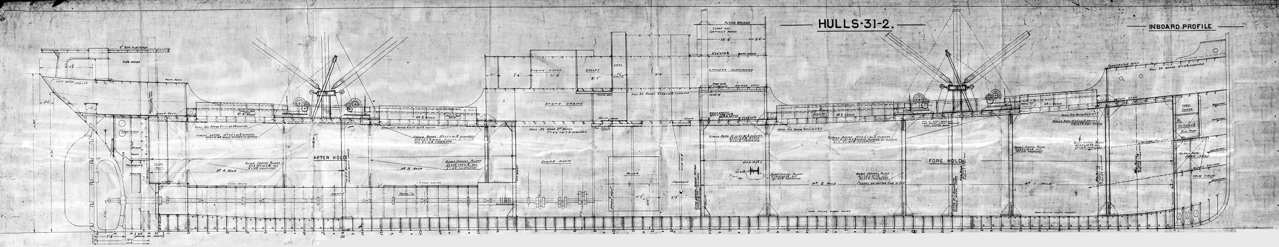 Extract from an inboard profile and deck plan issued in May 1917 by J. W. Millard & Bro. of New York, who designed the two ships for Tampa Shipbuilding. They were conventional small three-island freighters rigged initially with two single derrick posts and one radio mast which soon became two regular masts.