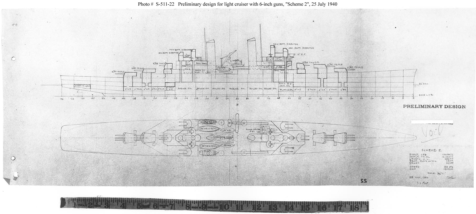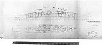 Photo #: S-511-22 Study of Light Cruiser with 6-Inch Guns, "Scheme 2" Preliminary design plan prepared for the General Board during an examination of light cruiser designs with the same gun armament as the Cleveland (CL-55) class, but with greater speed and improved protection. This plan, dated 25 July 1940, is for a 13,200-ton (standard displacement) ship, 680-feet long, with her aircraft facilities located amidships. It represented an effort to control weights and improve stability by reducing the after hull by one deck. Note that the cruiser has quadruple torpedo tubes amidships, immediately aft of the aircraft catapults. Scale of the original drawing is 1/32" = 1'. This drawing is marked "Void" and was presumably superseded by that seen in Photo # S-511-18. The original plan is in the 1939-1944 "Spring Styles Book" held by the Naval Historical Center. U.S. Naval Historical Center Photograph. Online Image: 286KB; 2000 x 900 pixels |