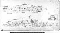 Photo #: S-511-51-E "Scheme "B-II" - Destroyer Study" Preliminary design plan prepared for the General Board as part of the process leading to the Allen M. Sumner (DD-692) class design. This 30 September 1941 plan, for a 2200-ton (standard displacement) ship, introduces the twin 5"/38 dual-purpose gun mount as a destroyer weapon. Three of these are provided, as well as two twin 40mm anti-aircraft guns and a single bank of five torpedo tubes, giving a less crowded arrangement amidships. Further developed as Scheme "B-VII" of 10 March 1942, this became the basic DD-692 design. The original plan is in the 1939-1944 "Spring Styles Book" held by the Naval Historical Center. U.S. Naval Historical Center Photograph. Online Image: 525KB; 3000 x 1680 pixels |