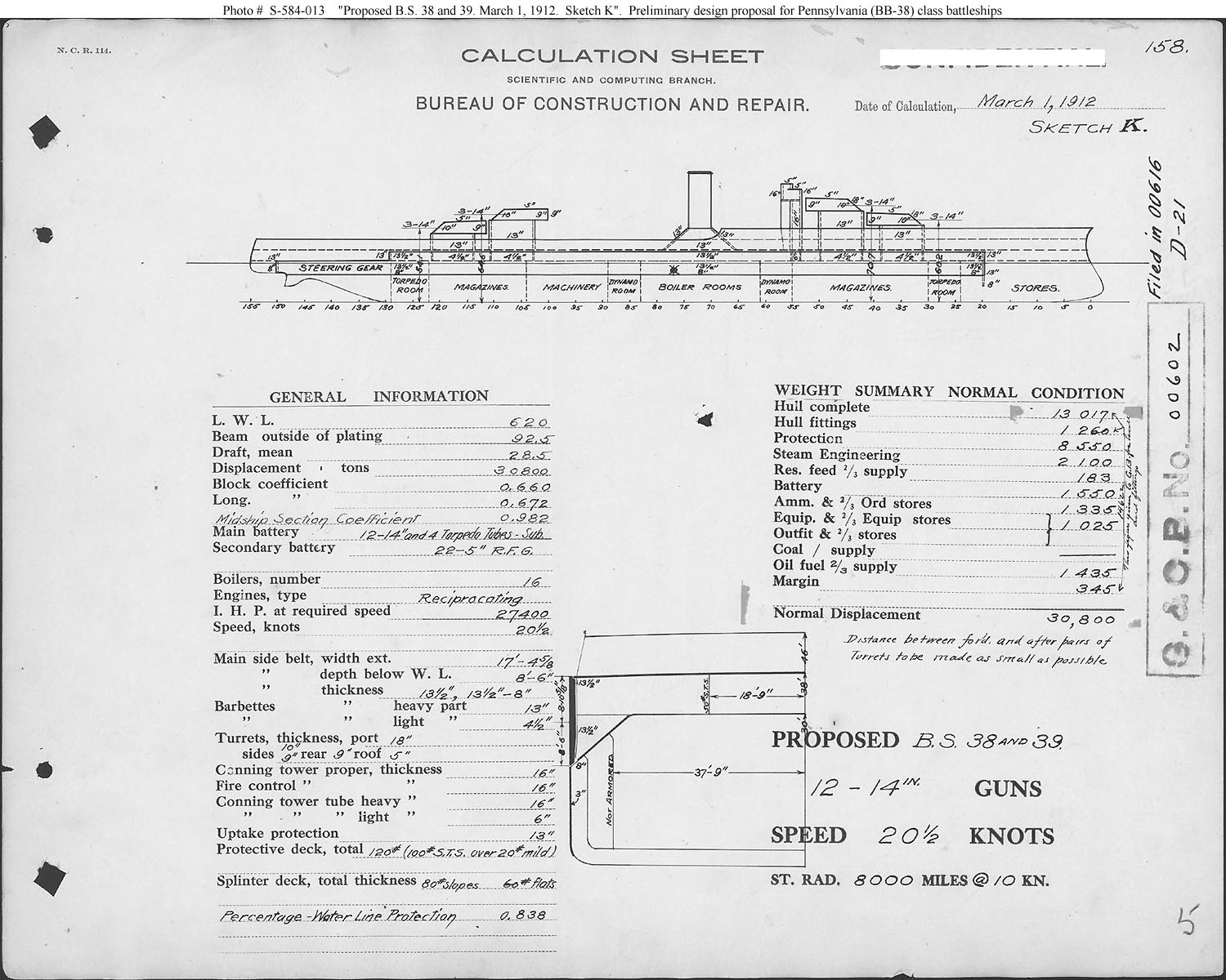Photo #: S-584-013 "Proposed B. S. [Battleships] Nos. 38 & 39" ... Scheme "K" ... March 1, 1912 Preliminary design plan for Fiscal Year 1913 battleships. This drawing was one of four sent to the Navy’s General Board on 2 March 1911 to illustrate options of interest. This plan was developed to illustrate the impact of modifying Scheme "G" (see Photo # S-584-010), which met all General Board characteristics goals, by limiting speed to 20.5 knots with reciprocating steam machinery rather than turbines. This plan shows a ship 10 feet shorter and 500 tons lighter than Scheme "G" but that maintained the same armament and protection. This plan provides twelve 14-inch guns, reciprocating steam machinery, and a speed of 20.5 knots in a ship 620 feet long on the load water line (L.W.L.), 92.5 feet in beam, with a normal displacement of 30,800 tons. Note: The original document was ink on paper (black on white). The original plan is in the 1911-1925 "Spring Styles Book". U.S. Naval History and Heritage Command Photograph. Online Image: 261KB; 1500 x 1200 pixels |