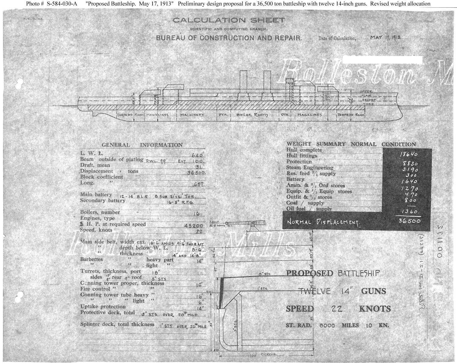 Photo #: S-584-030-A Proposed Battleship ... May 17, 1913 Preliminary design plan for a new battleship. This plan may have been developed to investigate the implications of reducing required speed to a more standard 22 knots in a new capital ship design concept that previously was based upon provision of comparatively high speed (25 knots.) This drawing is identical to Photo # S-584-030 except that the table of vessel component weights at the right is summarized into nine rather than eleven categories. This plan provides twelve 14-inch guns and a speed of 22 knots in a ship 640 feet long on the load water line (L.W.L.), 100 feet in beam, with a normal displacement of 36,500 tons. No ships were built of this type. Note: The original document was a blueprint (white on dark blue). The original plan is in the 1911-1925 "Spring Styles Book". U.S. Naval History and Heritage Command Photograph. Online Image: 407KB; 1500 x 1195 pixels |