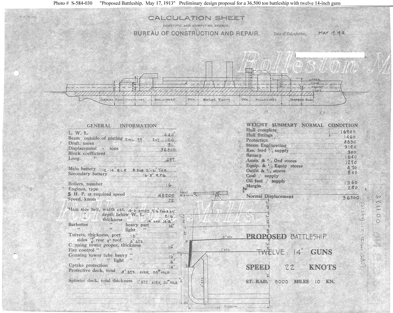 Photo #: S-584-030 Proposed Battleship ... May 17, 1913 Preliminary design plan for a new battleship. This plan may have been developed to investigate the implications of reducing required speed to a more standard 22 knots in a new capital ship design concept that previously was based upon provision of comparatively high speed (25 knots.) This plan resembles in general layout the earlier drawings for a fast battleship dated 14 February 1913 (see Photo # S-584-027) and 16 April 1913 (see Photo # S-584-029). It is not known what circulation was made of this design. This plan provides twelve 14-inch guns and a speed of 22 knots in a ship 640 feet long on the load water line (L.W.L.), 100 feet in beam, with a normal displacement of 36,500 tons. No ships were built of this type. Note: The original document was a blueprint (white on dark blue). The original plan is in the 1911-1925 "Spring Styles Book". U.S. Naval History and Heritage Command Photograph. Online Image: 359KB; 1500 x 1195 pixels |