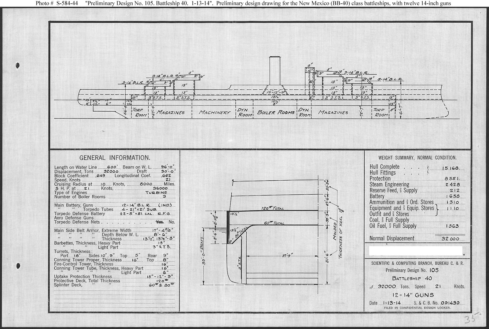 Photo #: S-584-044 Proposed Battleship # 40 ... January 13, 1914 Preliminary design drawing for Battleship # 40, which was planned for construction in Fiscal Year 1915. This drawing provides a design that reflected the decision by the Secretary of the Navy on 3 January 1913 that Battleship # 40 would replicate the Battleship # 38 design (see Photo # S-584-041), with the exception that the 14-inch guns were to be mounted independently rather than in single, three-gun sleeves, which could not elevate guns singly. This final plan differed from that drawn on 8 January (see Photo # S-584-043) in being 5 feet shorter, about one foot deeper in draft, and 400 tons lighter, and thereby was closer yet to the Battleship # 38 prototype. This plan provides twelve 14-inch guns, turbine machinery, and a speed of 21 knots in a ship 600 feet long on the load water line (L.W.L.), 96 feet in beam, with a normal displacement of 32,000 tons. Note: The original document was ink on linen (black on white). The original plan is in the 1911-1925 "Spring Styles Book". U.S. Naval History and Heritage Command Photograph. Online Image: 317KB; 1600 x 1075 pixels |